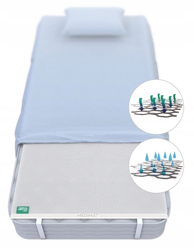 MEDiMAT AirFlow 60 x 120 см - це інноваційний продукт, повністю виготовлений у Польщі. Призначений для використання в якості протипролежневої накладки на матрац, односпальне ліжко або диван. MEDiMAT запобігає утворенню нових пролежнів і підтримує процес загоєння раніше наявних пролежнів першого ступеня.