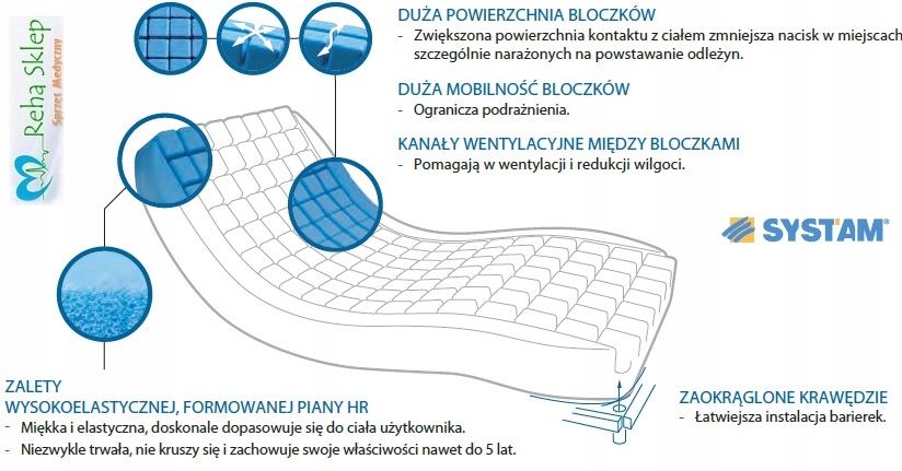 - Завдяки великій поверхні блоків (кубів) матрац знижує тиск на пацієнта тіло в місцях, особливо чутливих до пролежнів (сідниці, куприк тощо)