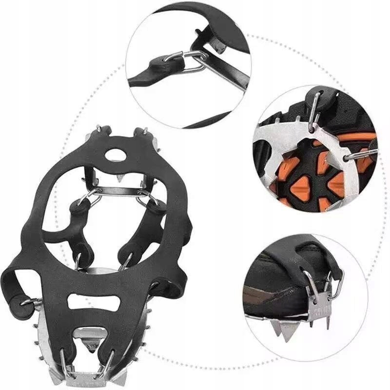 - 18 цвяхів із нержавіючої сталі забезпечують чудове зчеплення та допомагають уникнути падіння на пласкій, тонкій, крижаній або засніженій поверхні.