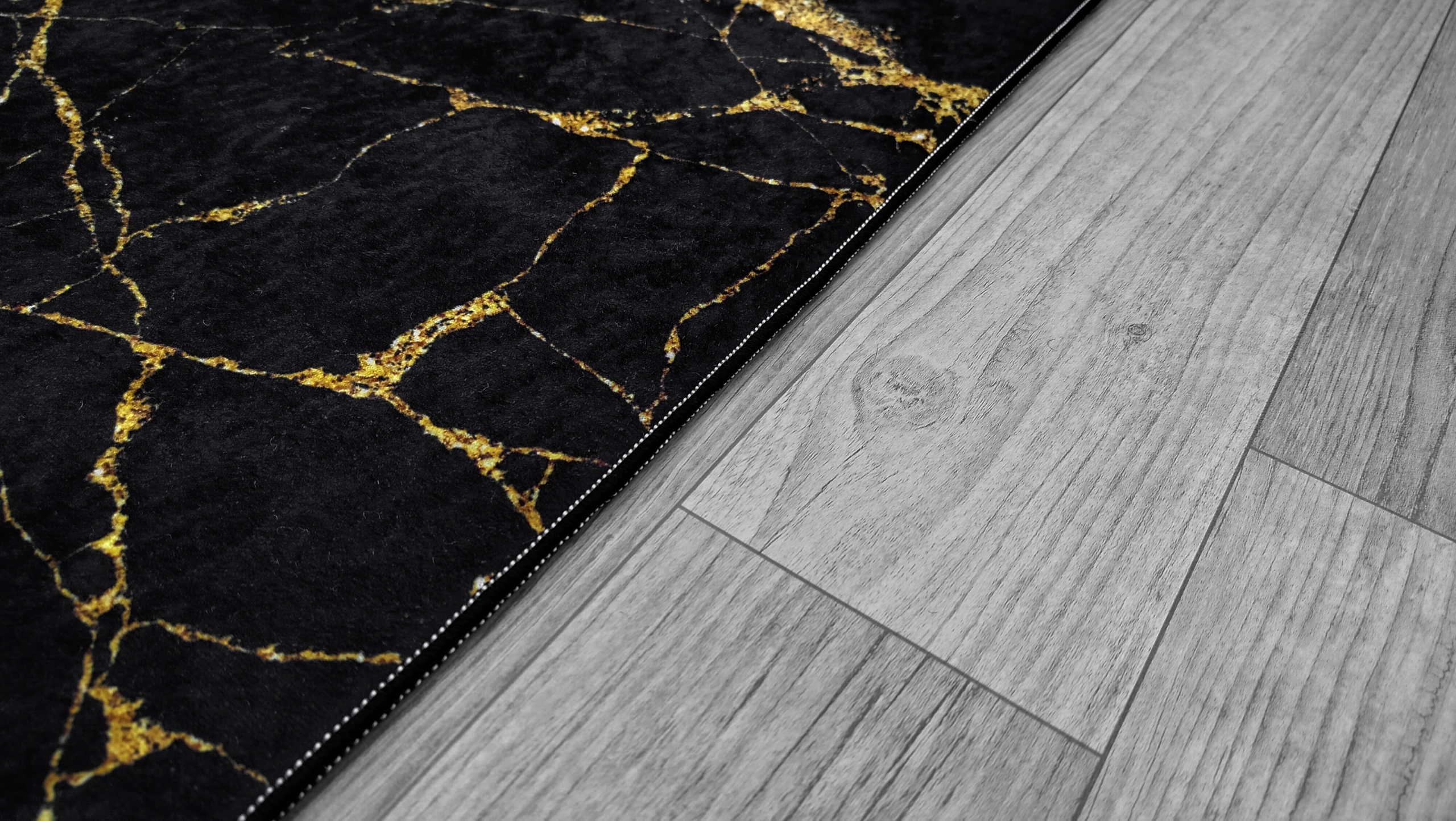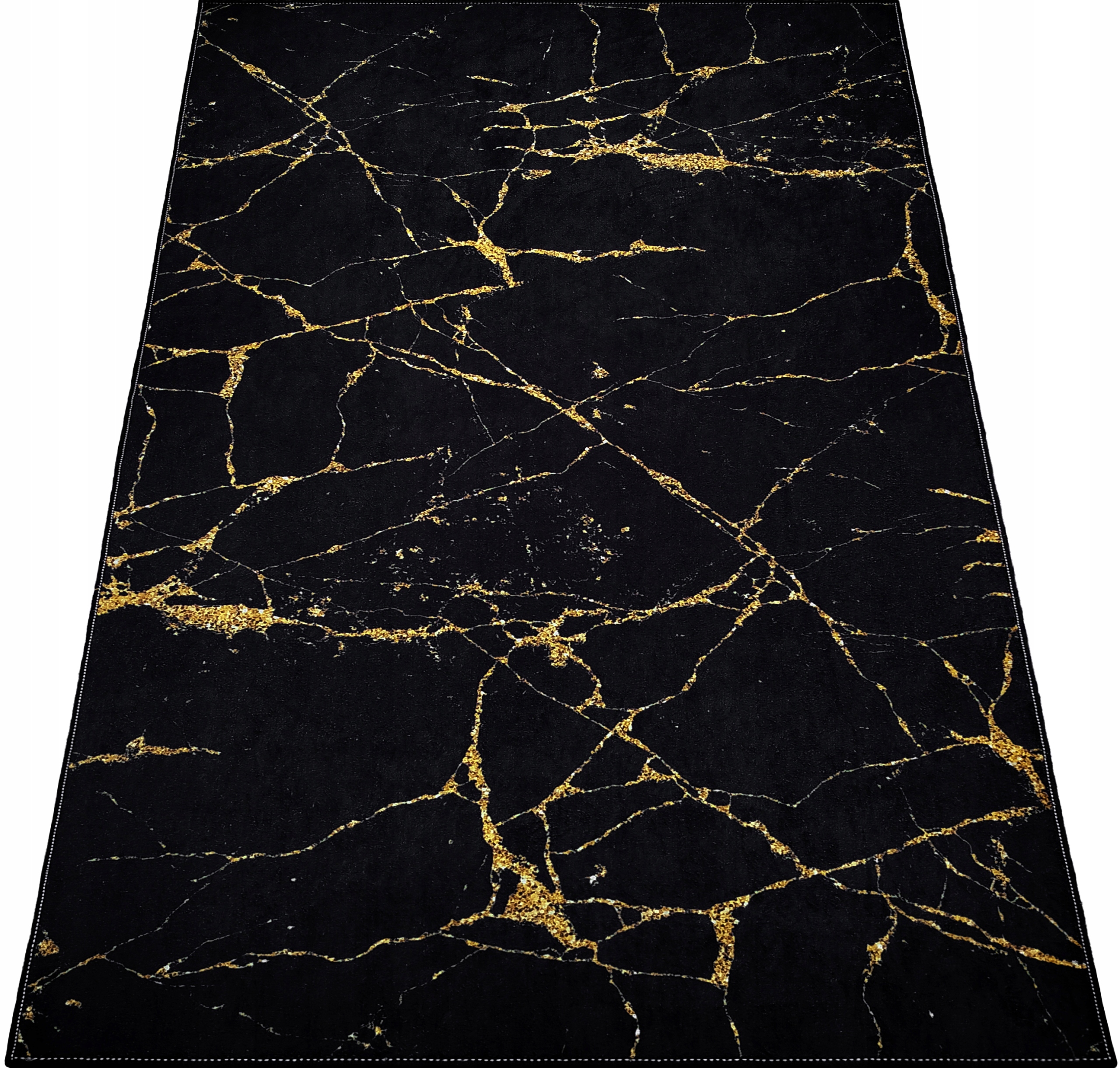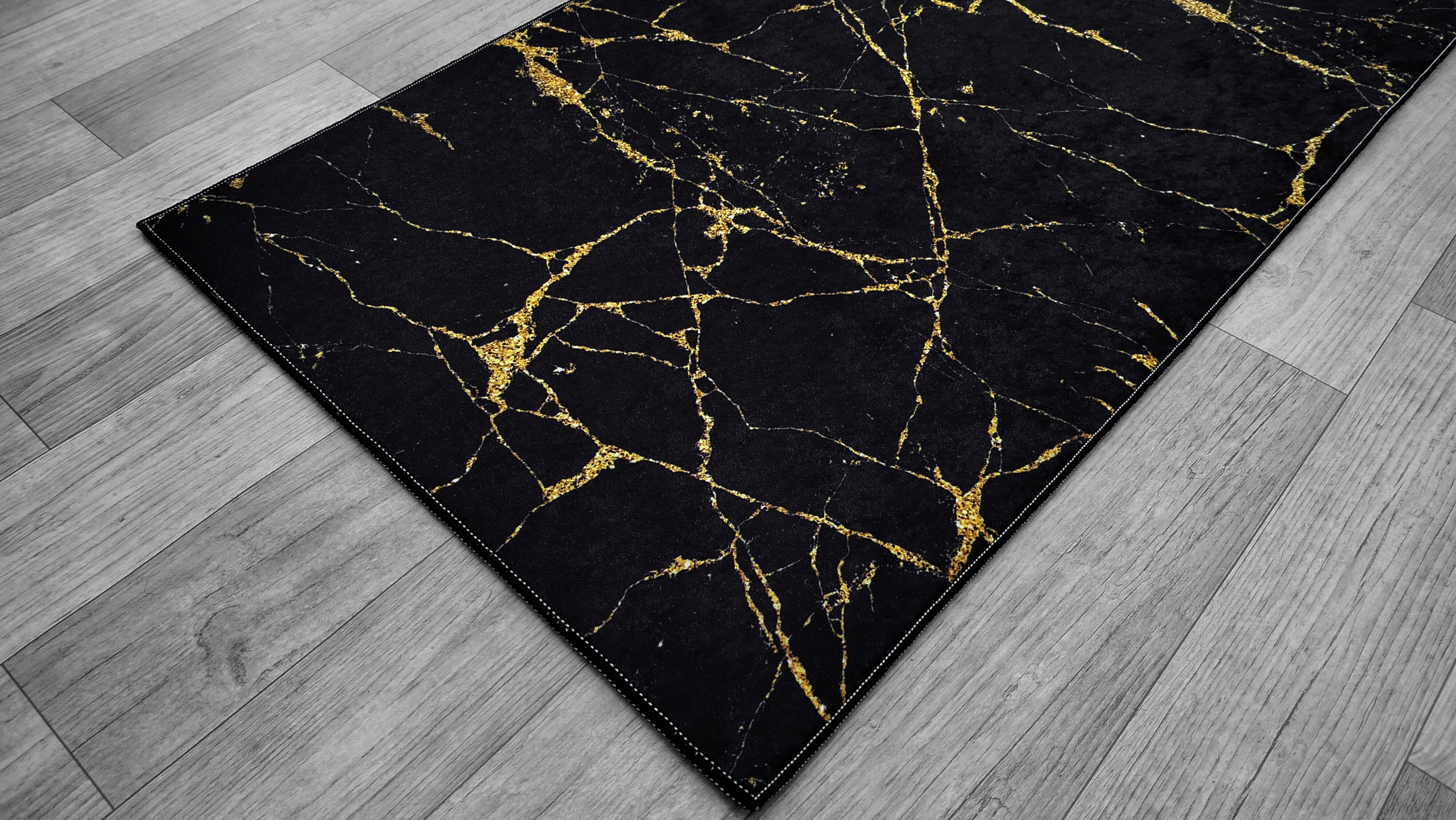 Візерунок на килимі імітує чорний мармур, з жовтими тріщинами, що надає кімната має елегантний і розкішний вигляд. Він практичний, оскільки його можна прати в машині, що дозволяє легко підтримувати його в чистоті та свіжості.