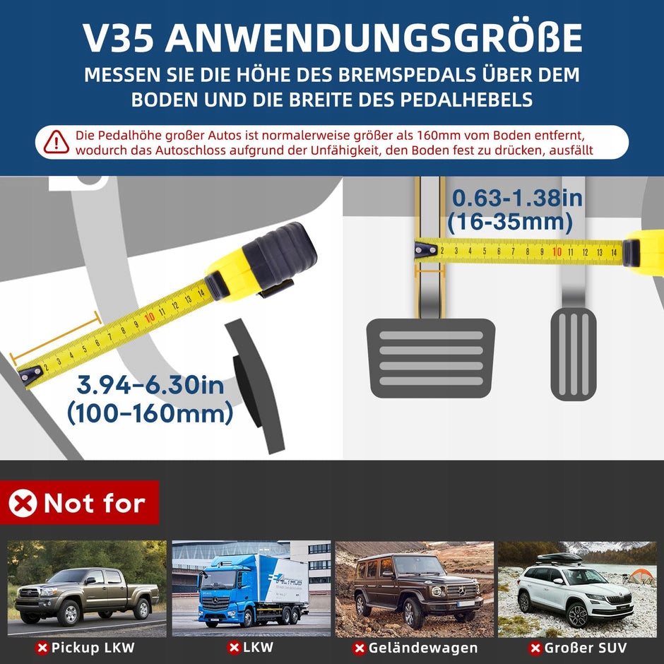 Цей протиугінний пристрій підходить для гальм/зчеплень висотою від 100 до 160 мм і шириною від 16 до 35 мм. Перед покупкою обов’язково виміряйте висоту та ширину педалі зчеплення чи гальма у вашому автомобілі.