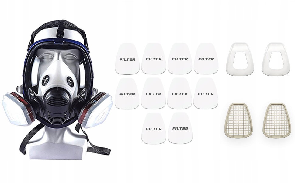 - У повнолицьовій масці з фільтром використовується професійна подвійна система фільтрації, яка ефективно фільтрує будь-які випари або випари органічних хімікатів, пилу та інших частинок у повітря.