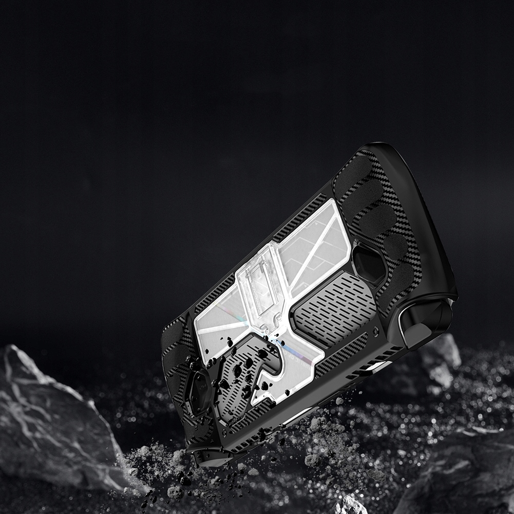 М’яка та гнучка оправа по краях консолі і жорстка броня створюють надійну і міцну конструкцію, захищаючи пристрій від подряпин і падінь. Корпус виготовлений із суміші м'якого термопластику та зміцнюючого полікарбонатного покриття. Обидві частини підходять разом для створення надійного та довговічного захисту.
