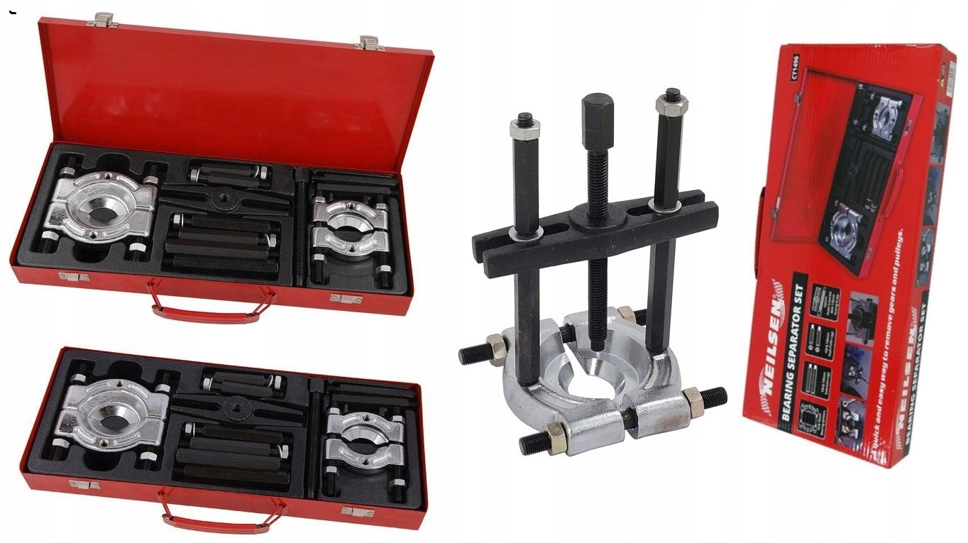 Пристрій використовується для для видалення підшипників, передач, шківів, роликів та інших підсолоджених деталей, що використовуються в механіці. Весь упакований у металеву валізу.