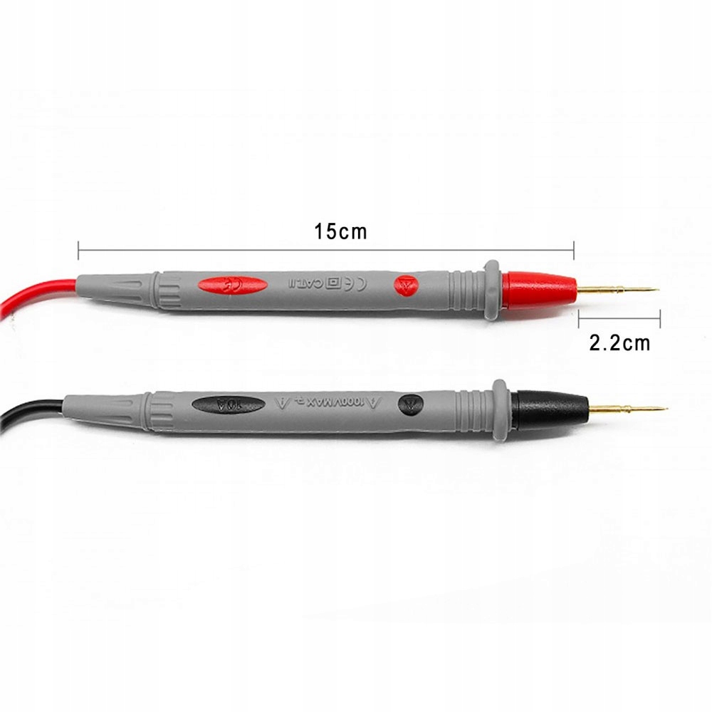 Високоякісні кабелі для вимірювання довжиною 90 см для використання в мультиметрах зі стандартним гніздом типу «банан». Тонкі кінчики голок для точних вимірювань, довжиною близько 2 см, весь зонд має довжину близько 15 см і добре лягає в руку. У комплект входять кліпси-крокодили на тонких спицях, що дозволяє знімати мірки без допомоги рук, що робить роботу більш зручною. На кінцях кабелів є штекери типу «банан», які підходять для більшості мультиметрів.