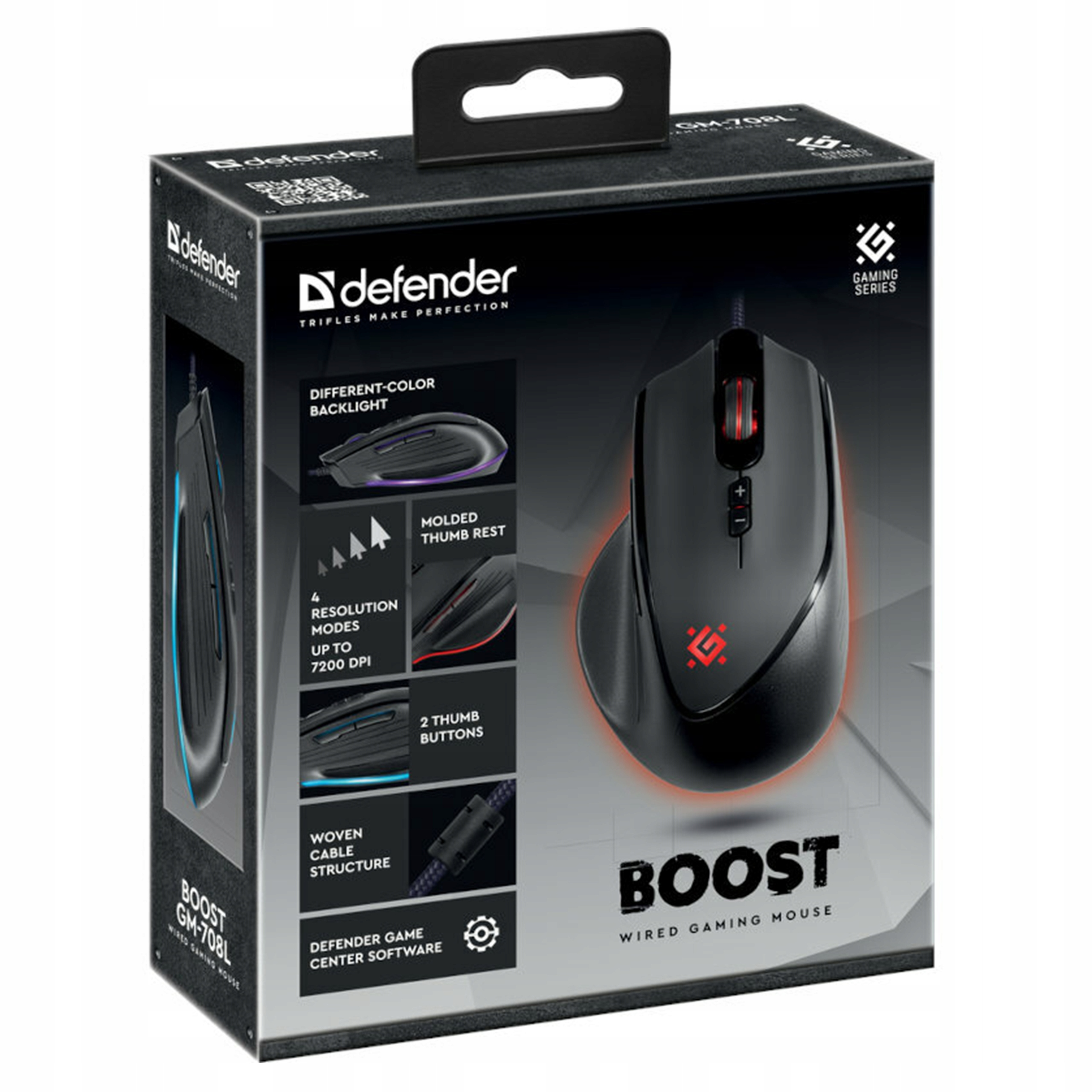 DEFENDER Boost GM-708L — це оптична миша, розроблена для геймерів, яка підходить до рук кожного правша. Його цікавий і зручний дизайн стабільно сидить у руці і точно направляє вашу руку, ідеально відтворюючи будь-яку діяльність на моніторі. Це важлива функція для напружених ігор.
