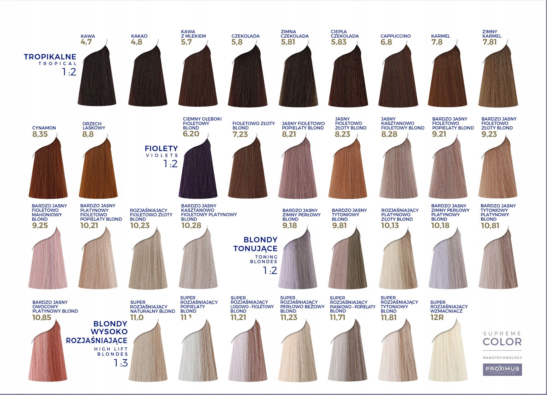Proximus Supreme Color Nanotechnology Hair Dye - це прорив пропозиції бренду. Це гарантує нову якість нанолороризації за надзвичайно сприятливу ціну. Формула фарби була вдосконалена для волосся, що все частіше піддається сильному шкідливому впливу зовнішніх та цивілізаційних факторів.