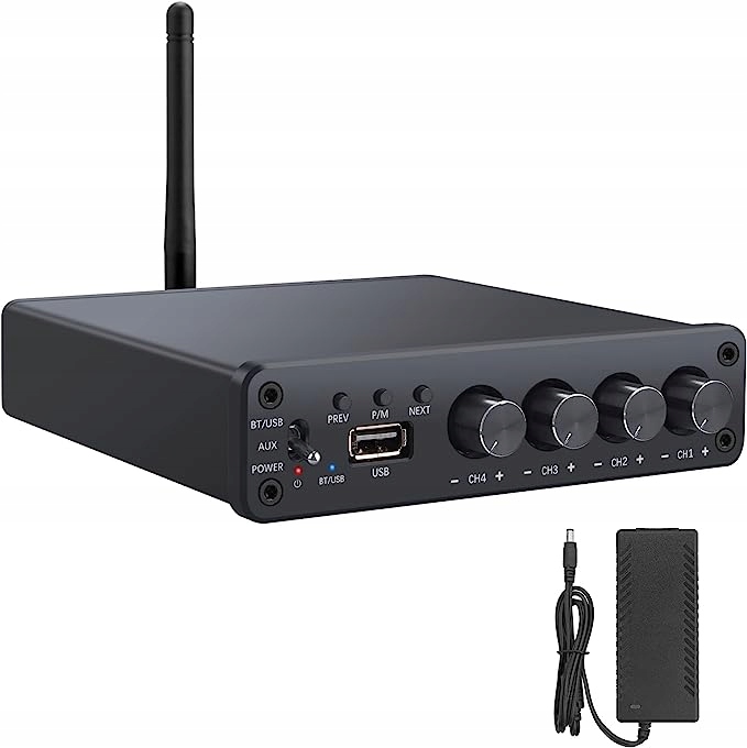 [4.0-канальний аудіопідсилювач потужності] Цей 4-канальний аудіопідсилювач потужності може підтримувати підключення 4 динаміків як вихід і підтримує функцію мікшування одночасно, яку можна регулювати за допомогою кнопки на підсилювачі, забезпечуючи ідеальну музику досвід для більшості любителів музики. (із сертифікованим джерелом живлення 24 В/4,5 А)