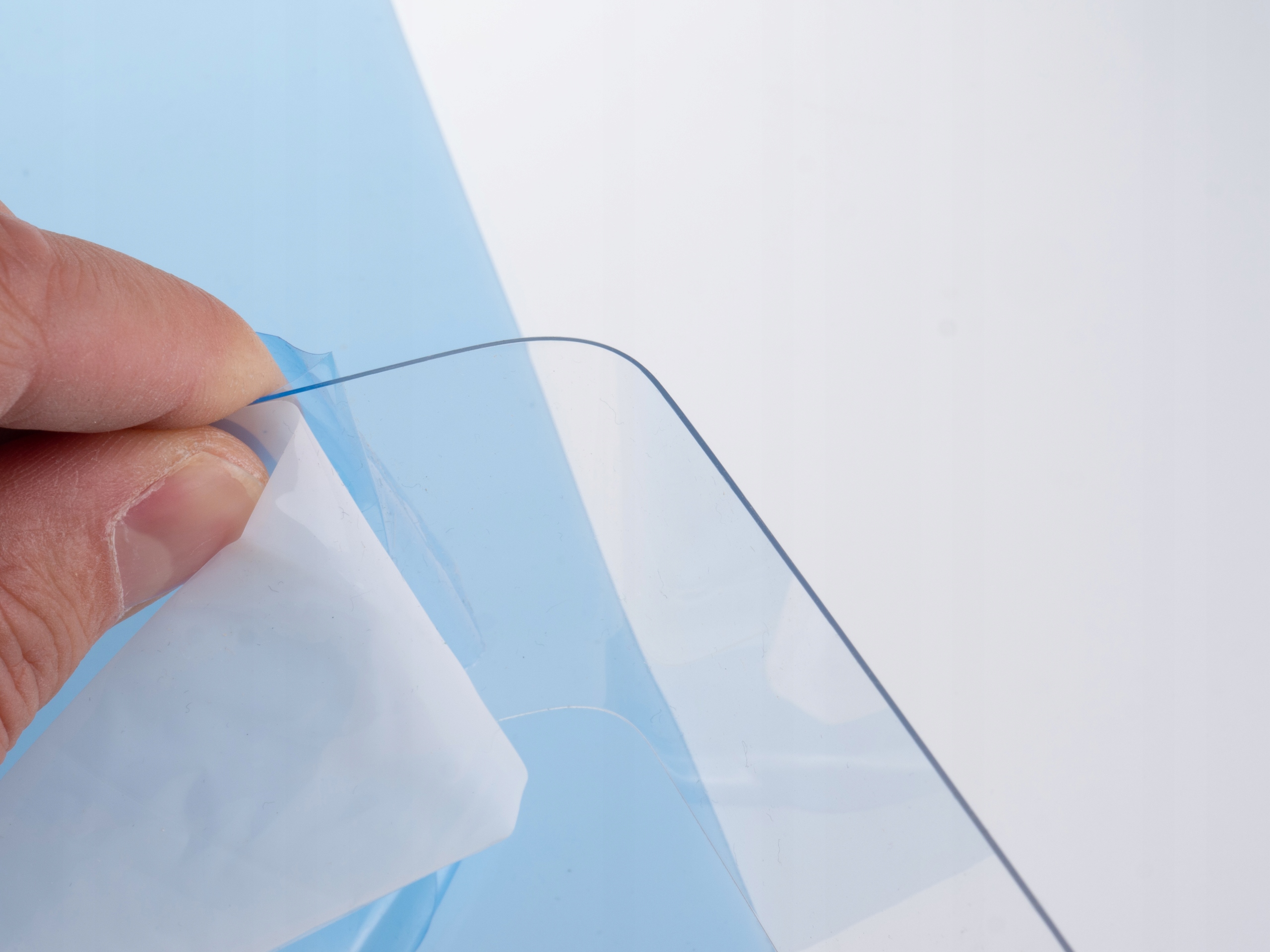 - Фотографії представлені точно пропоновану товщину, показану на тлі руки. Лист покритий з обох боків захисною плівкою, з одного боку білого кольору, а з іншого синього кольору, тому тарілка виглядає так, як вона була синьою. На фотографії також показано згинання зразка матеріалу після нагрівання.