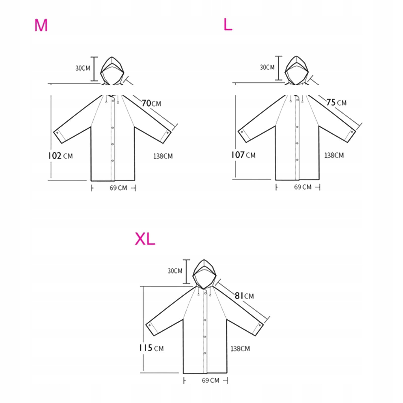 Довжина XL 115 см/45,3 дюйма, висота капюшона 30 см/11,8 дюйма, довжина рукава 81 см/32 дюйма, обхват грудей 138 см/54,3 дюйма, ширина 69 см/27 дюймів.
