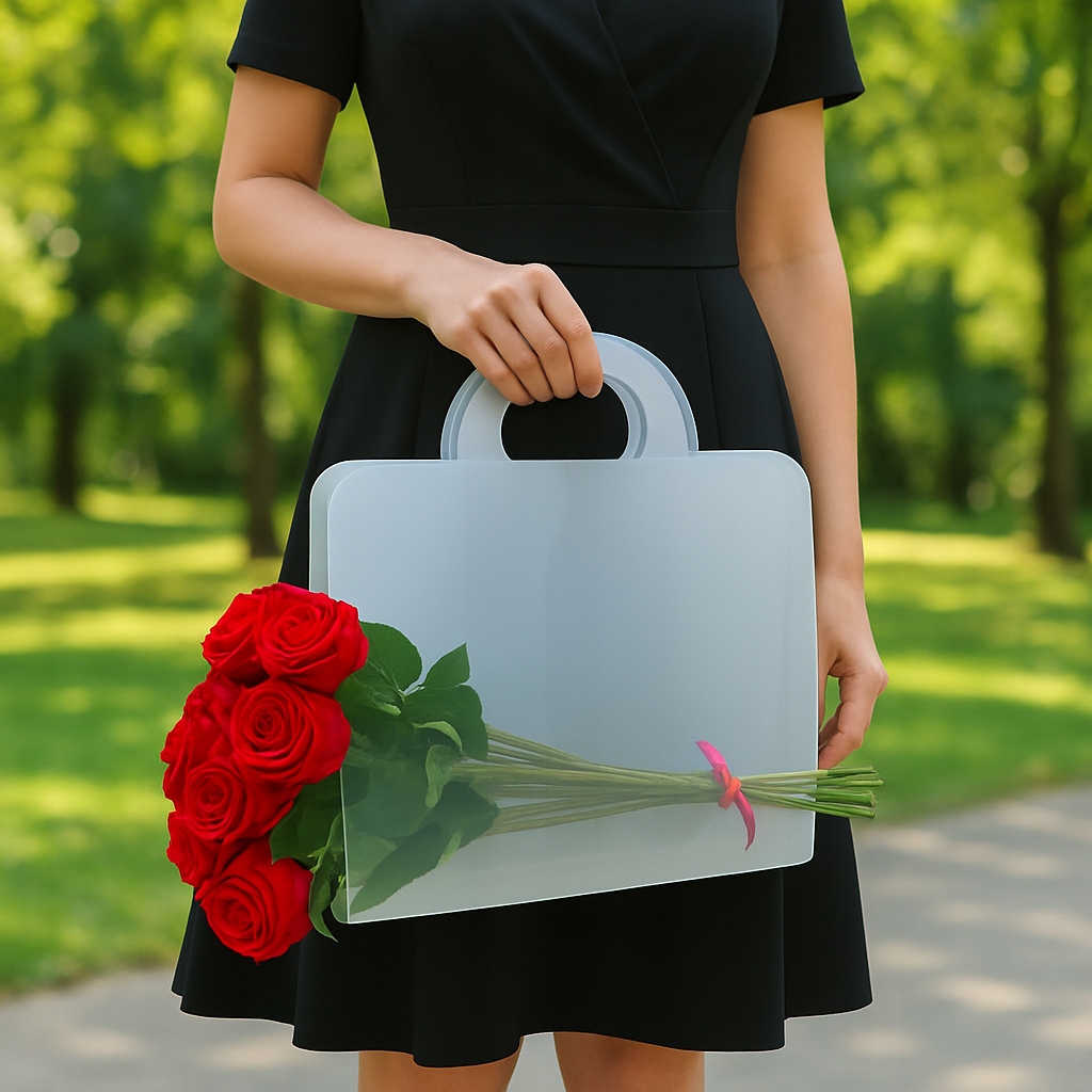Отвори в основі дозволяють прикріпити квіти за допомогою шнурка або стрічки, завдяки чому букет не вислизне з сумки.