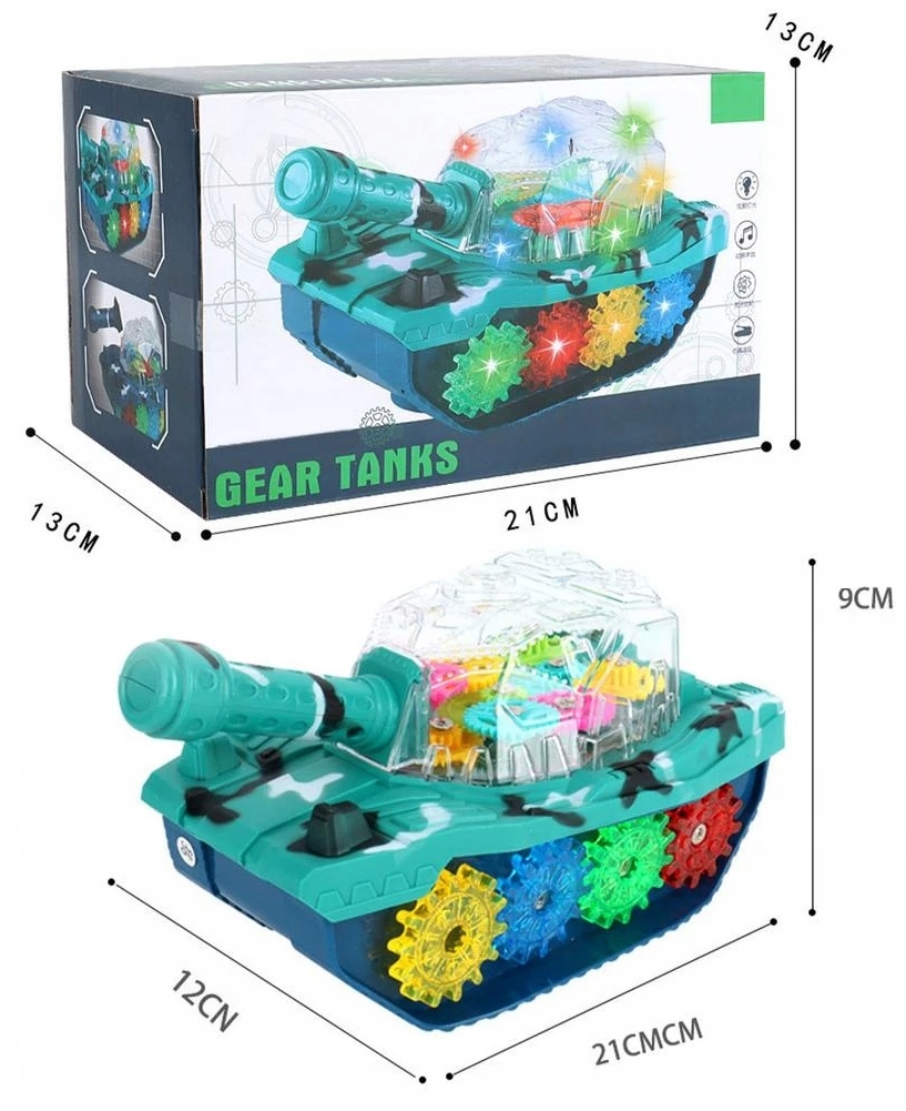 Прозорий іграшковий танк із кольоровими шестернями всередині. Ці шестерінки обертаються разом із рухом танка, який автоматично змінюється, коли він стикається з перешкодою під час руху .напрямок руху. Танк має світлові та звукові ефекти.