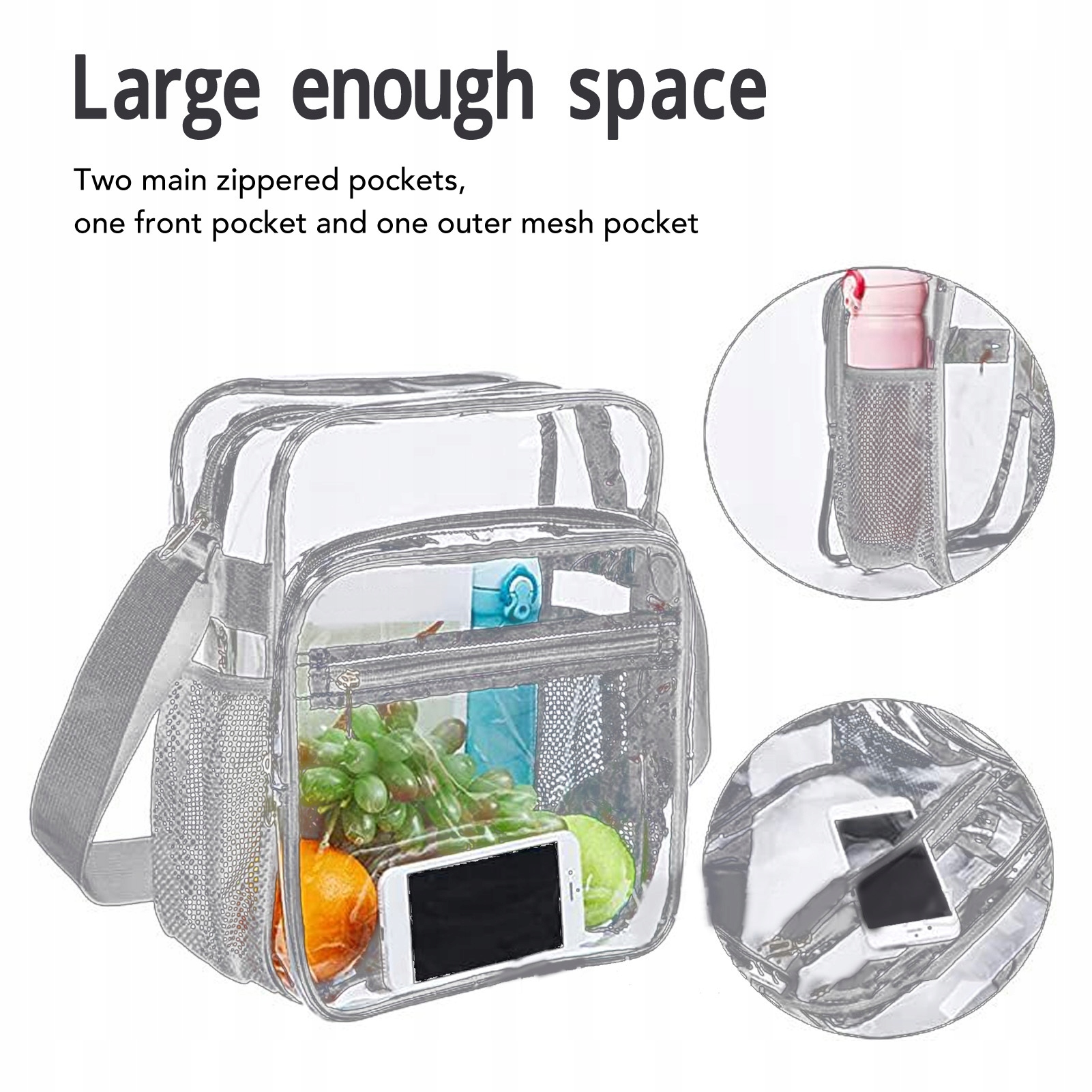2. Великий простір: прозора сумка для плечей ПВХ є компактною, але достатньо велика, щоб носити найважливіші предмети у двох лайнах звірних замків, передньої кишені та зовнішньої сітчастої кишені.