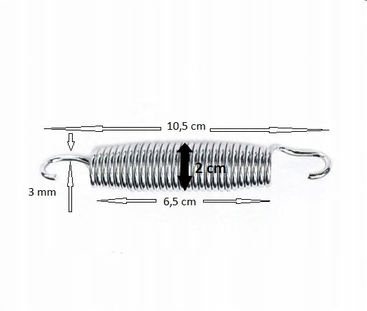 Рекомендую нові пружини для батутів різного діаметру, як на фото нижче. Загальна довжина (з гачками) 105 мм. Діаметр загартованого і хромованого дроту 3 мм. Ці пружини дуже стійкі до розтягування і злому - 28 Н. Конічна структура, тобто витки зменшують діаметр на кінцях. Ця пружинна конструкція використовується в професійних батутах.