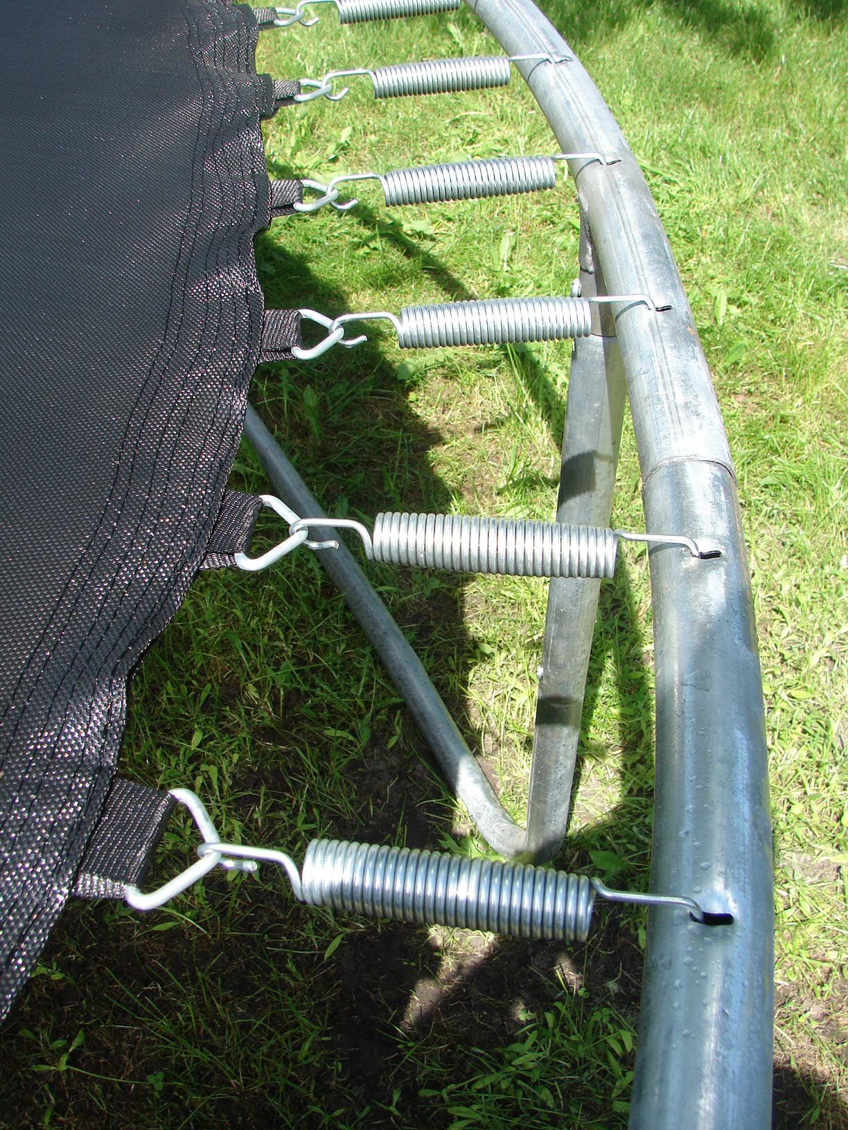 Рекомендую нові пружини для батутів різного діаметру, як на фото нижче. Загальна довжина (з гачками) 116,4 мм. Діаметр загартованого і хромованого дроту 3 мм. Ці пружини дуже стійкі до розтягування і злому - 28 Н. Конічна структура, тобто витки зменшують діаметр на кінцях. Ця пружинна конструкція використовується в професійних батутах.