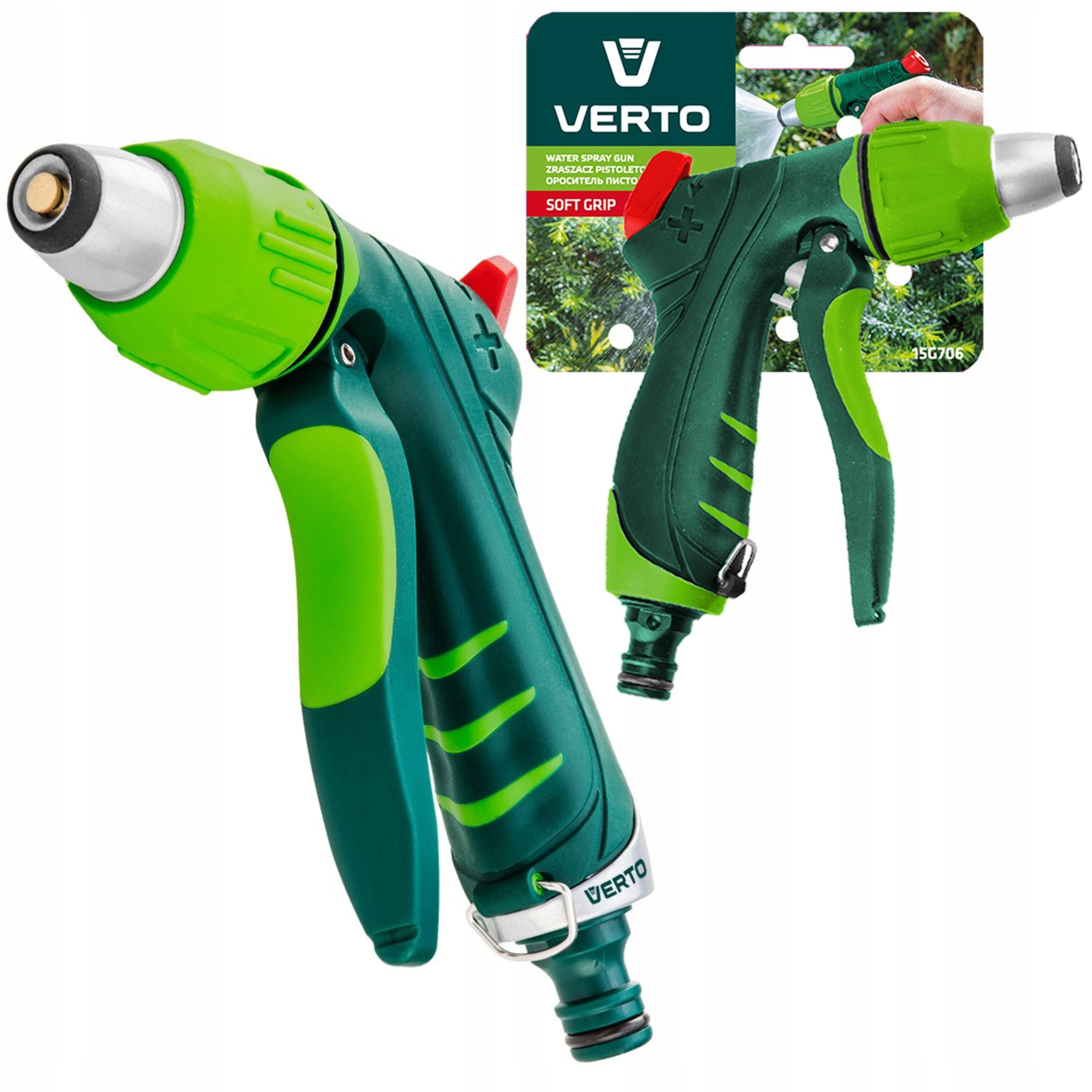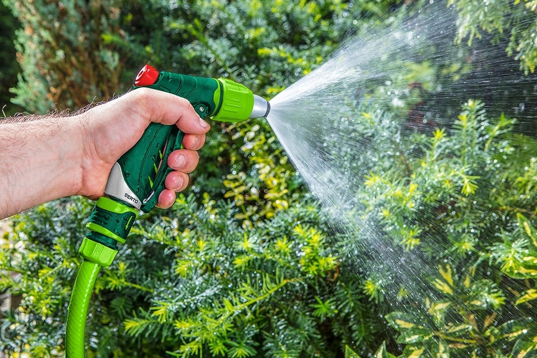 Верто Регульований Pistol Sprinkler (посилання 15G706). Регульована головка дозволяє встановити форму водного потоку з туману до сильного потоку. У пістолеті є замок переднього важеля, щоб він міг працювати в безперервному режимі. Власник ергономічної форми добре вписується в руку і не ковзає, що збільшує комфорт роботи.