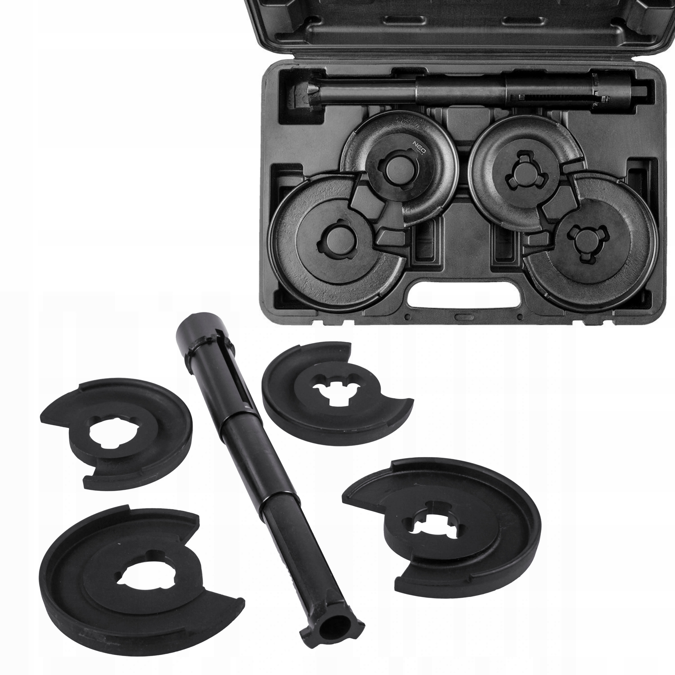 Компрессор пружин телескопічний 11-798, NEO TOOLS набір призначений для демонтажу та налаштування передньої та задньої гвинтової пружини. Набір оснащений двома парами змінних дисків з тригачковою системою безпеки. Все зібрано у валізу.