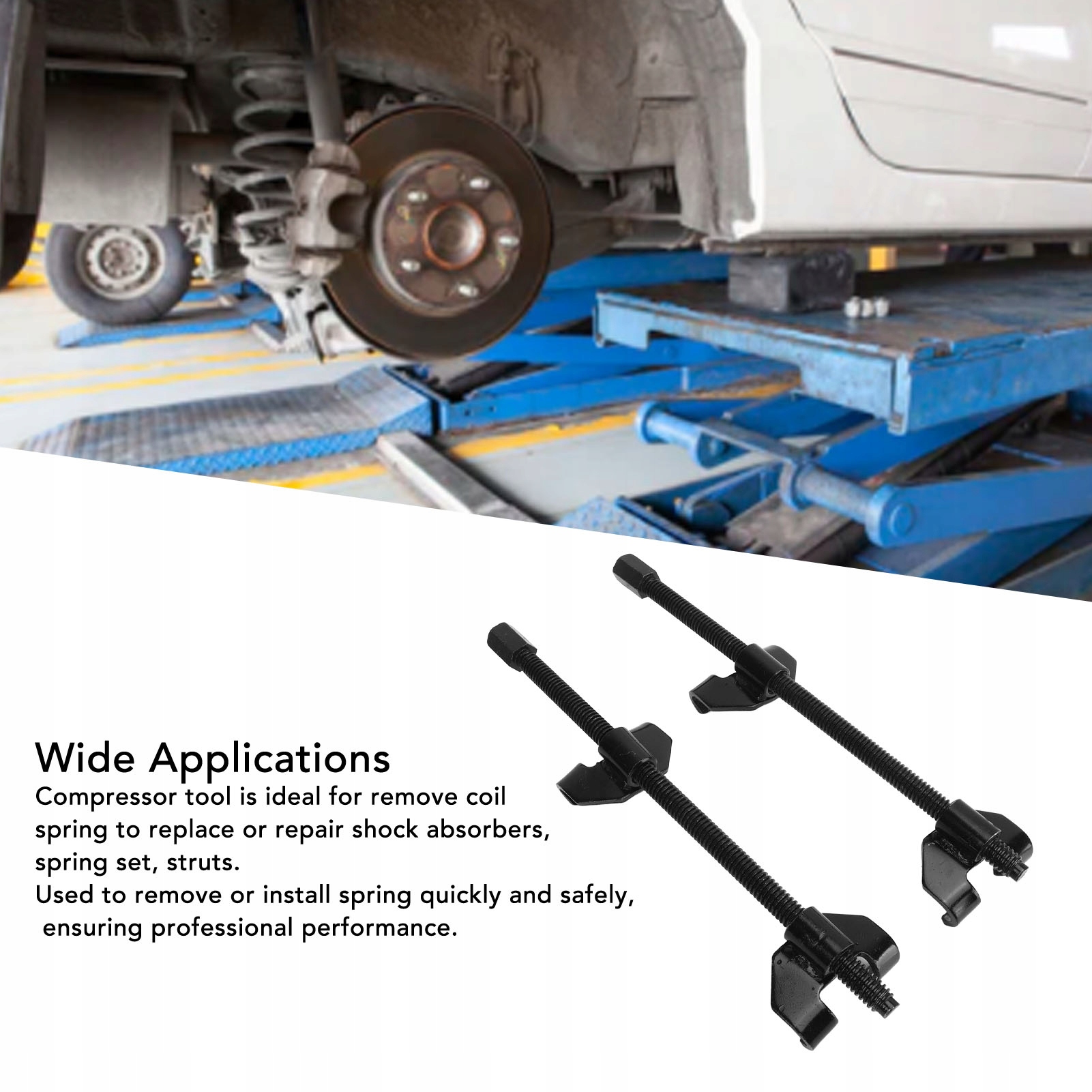 2. Широке застосування: інструмент стиснення підвіски ідеально підходить для зняття гвинтових пружин для заміни або відновлення амортизаторів, набору пружин, підкосів.