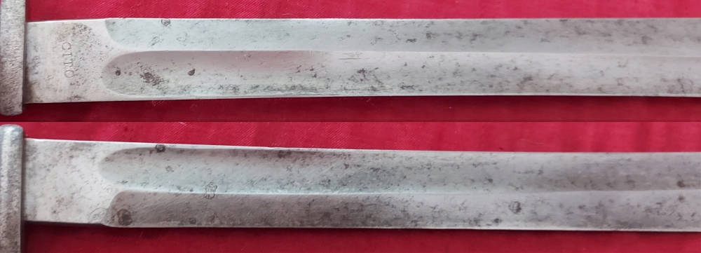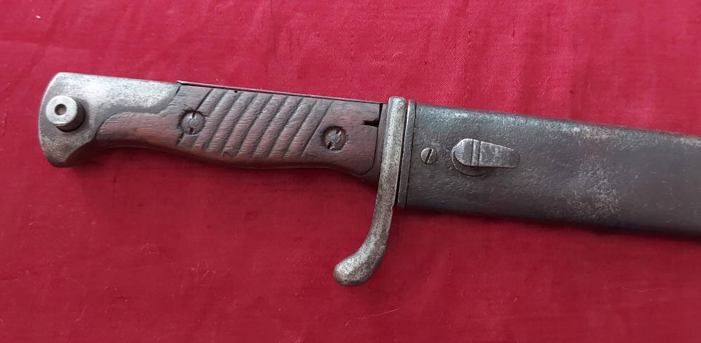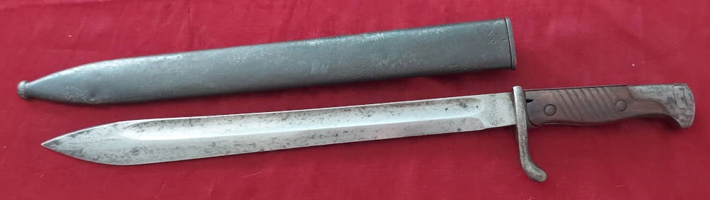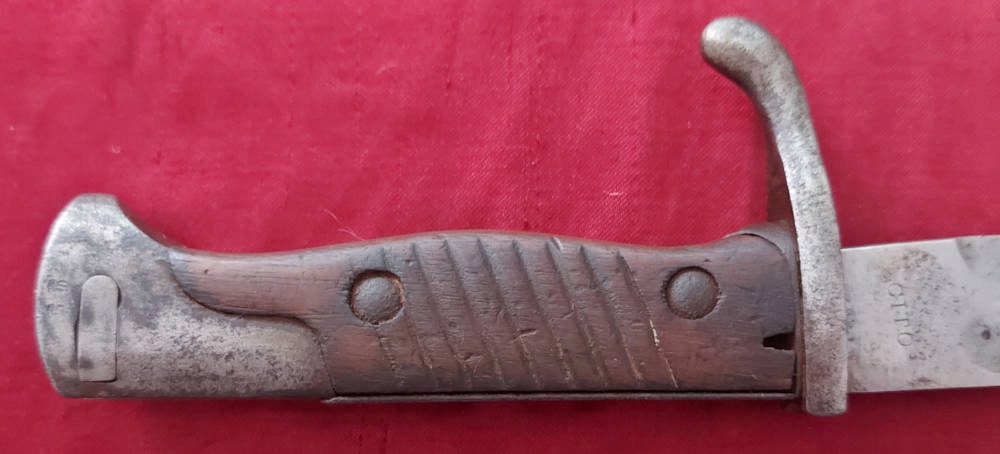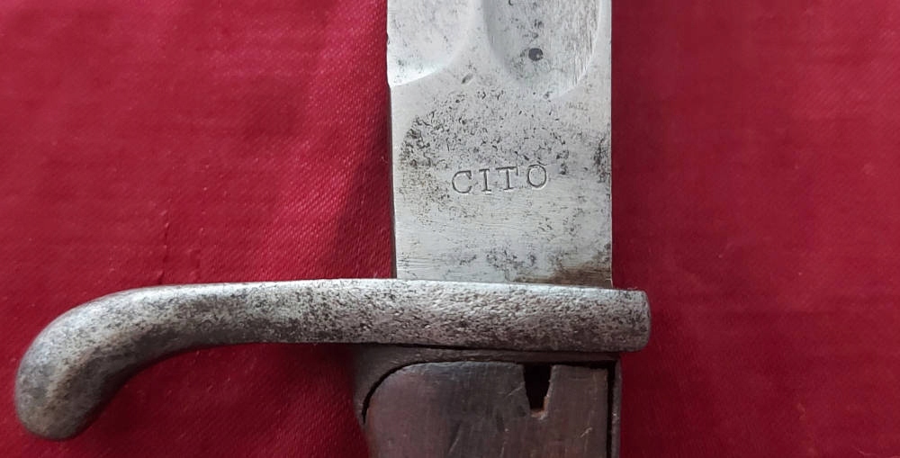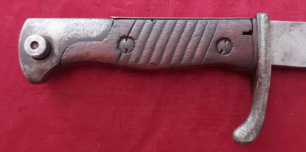 przedmiotem sprzedaży Jest Bagnet Pruski S98/05 - Liść. Чорне лезо. На порозі леза cito . Байнети цього виробника не мали прийняття на задній частині леза. Обшивка ручки дерев’яна, оригінальна. Прусські панки були зламані на голові. Замок Bayonet функціональний.