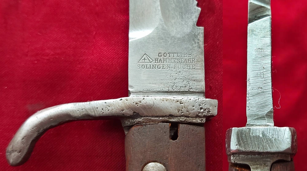 Копія, видна на фотографіях. На пороговому лезі підпис виробника Gottlieb Hammesfahr Solingen Foche . Голова, Джелек і Леза були зашпакували. На задній частині голови підписів вони розмиті. Ви можете побачити рік квитанції 1916 . Обшивка ручки не є оригінальною. Замок Bayonet функціональний.