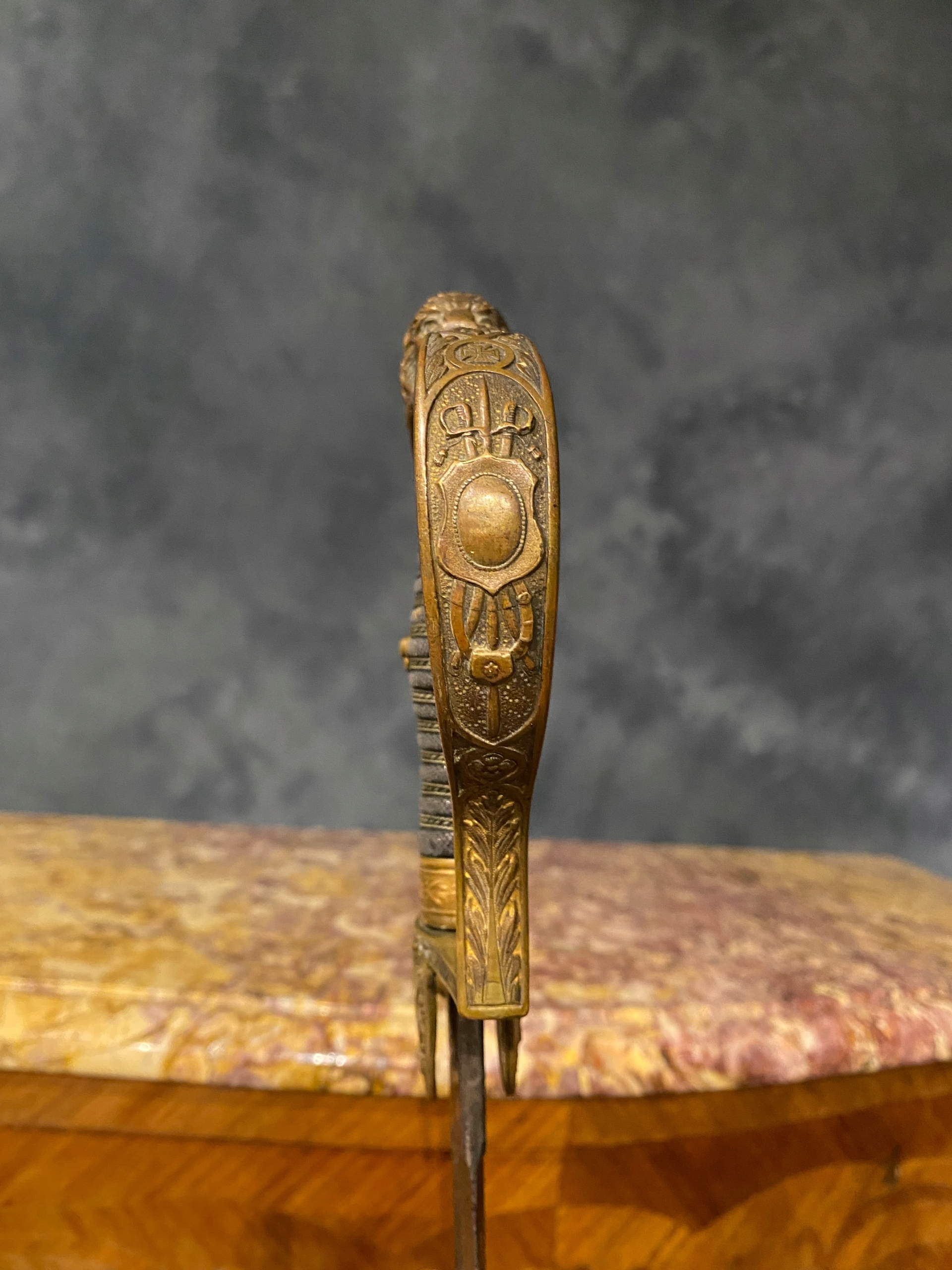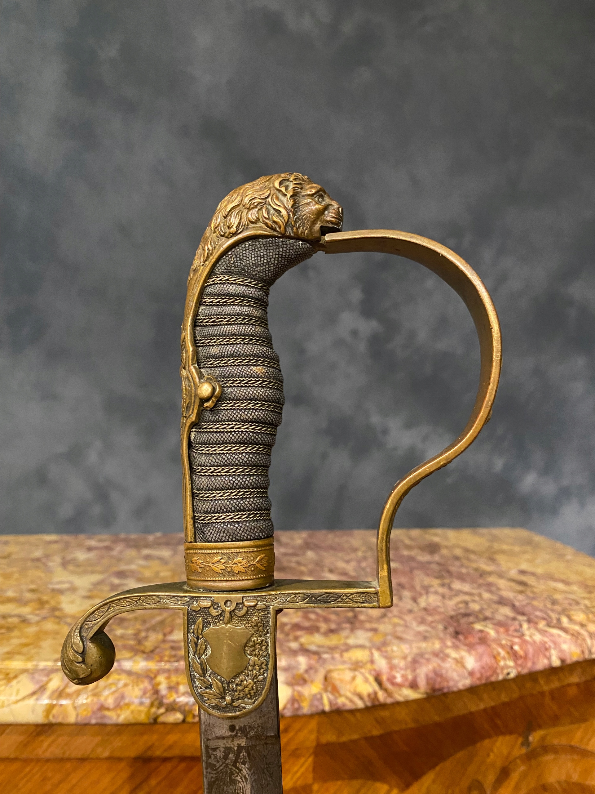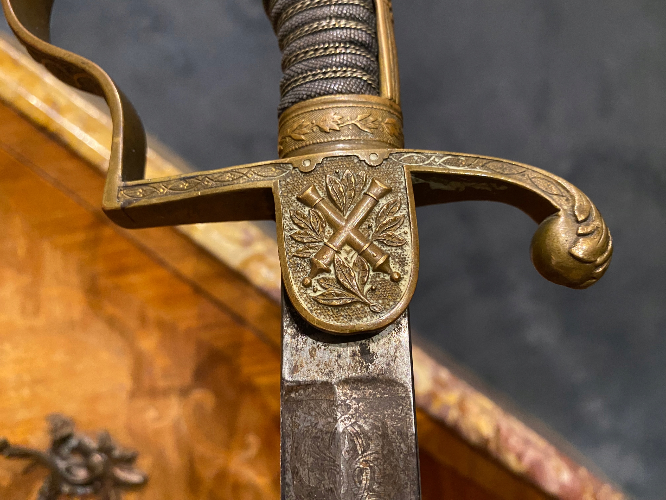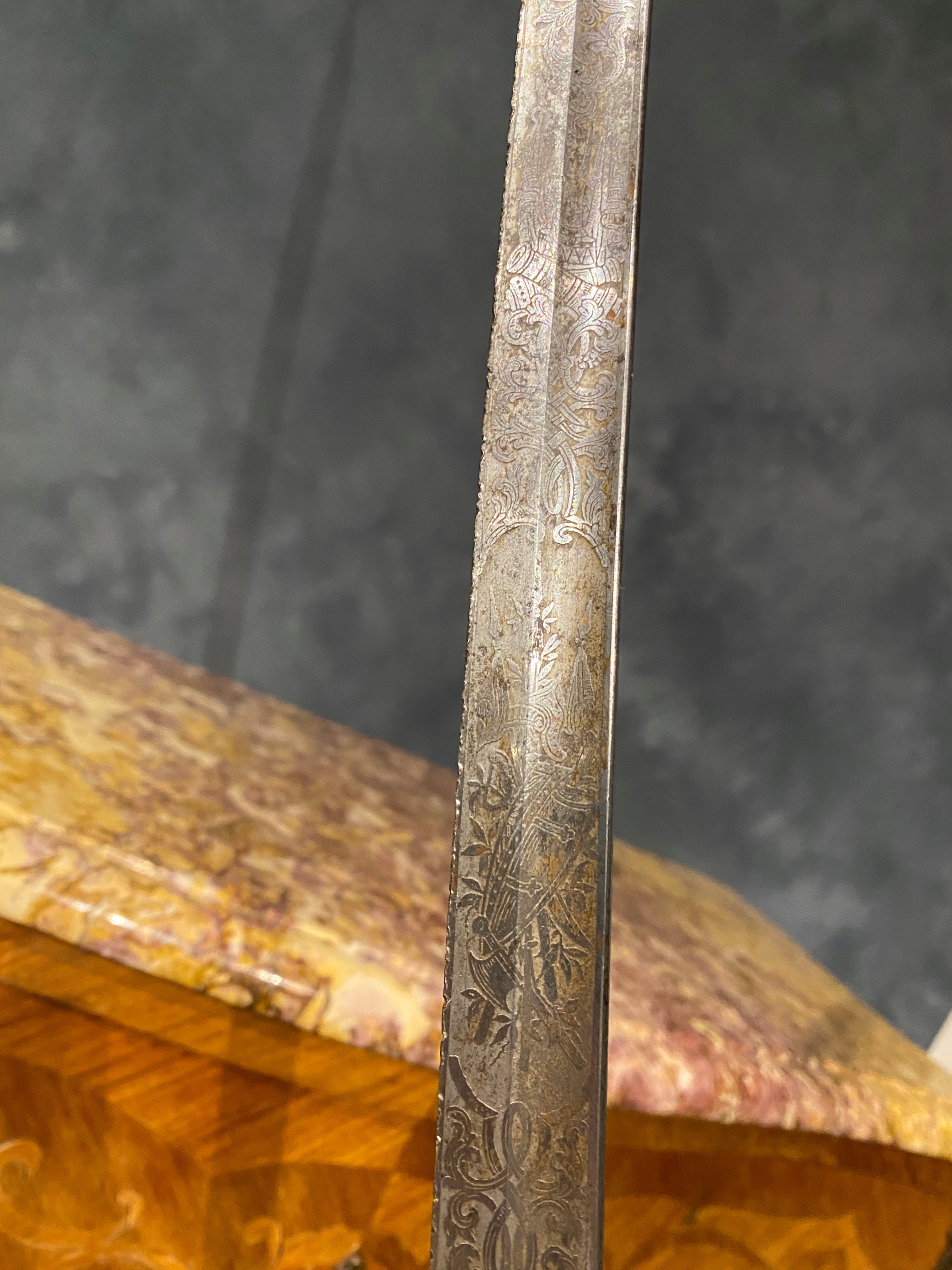 Нікельне лезо, прикрашене з двох боків, овочевим орнаментом з паноплом. CM