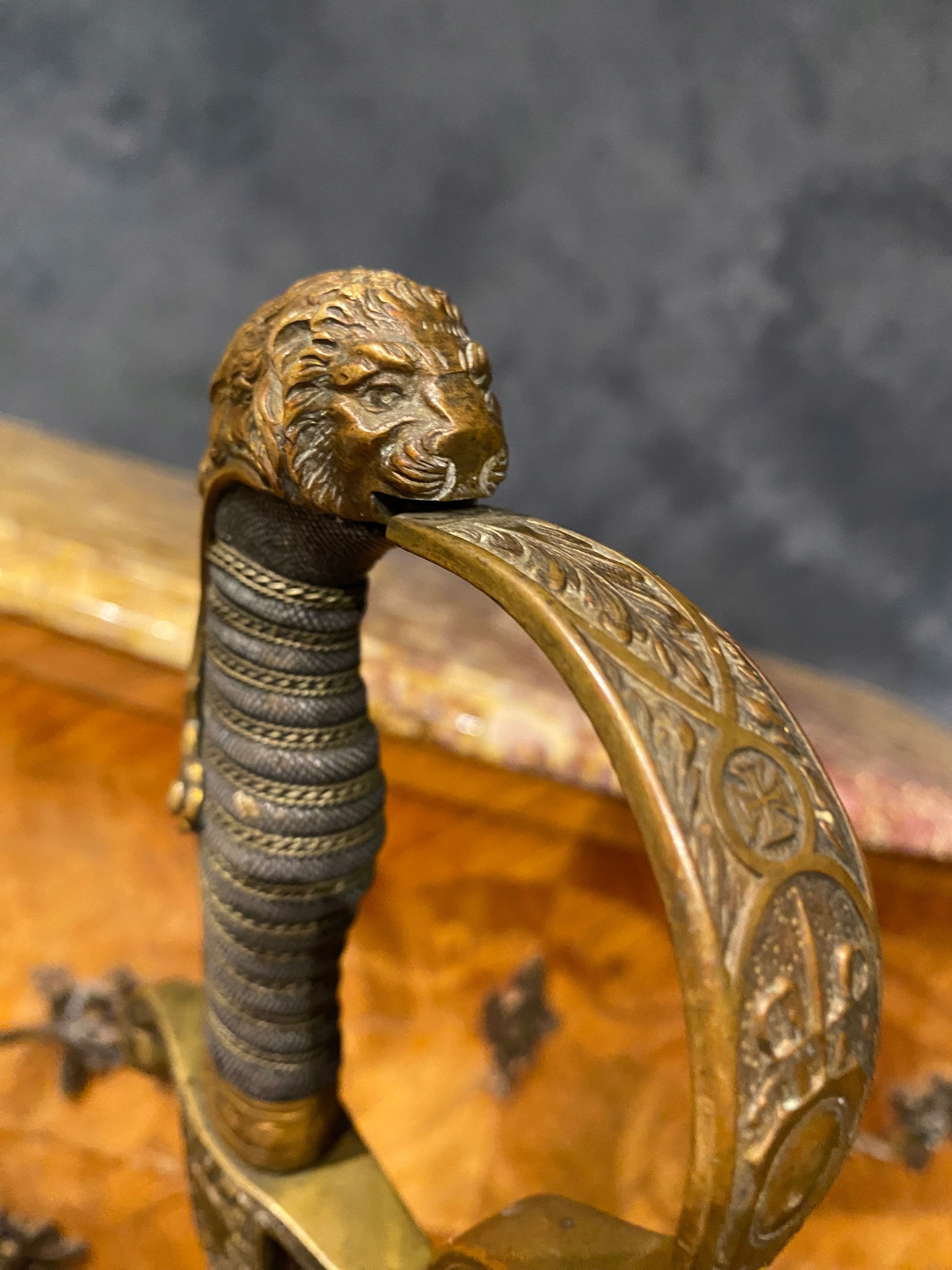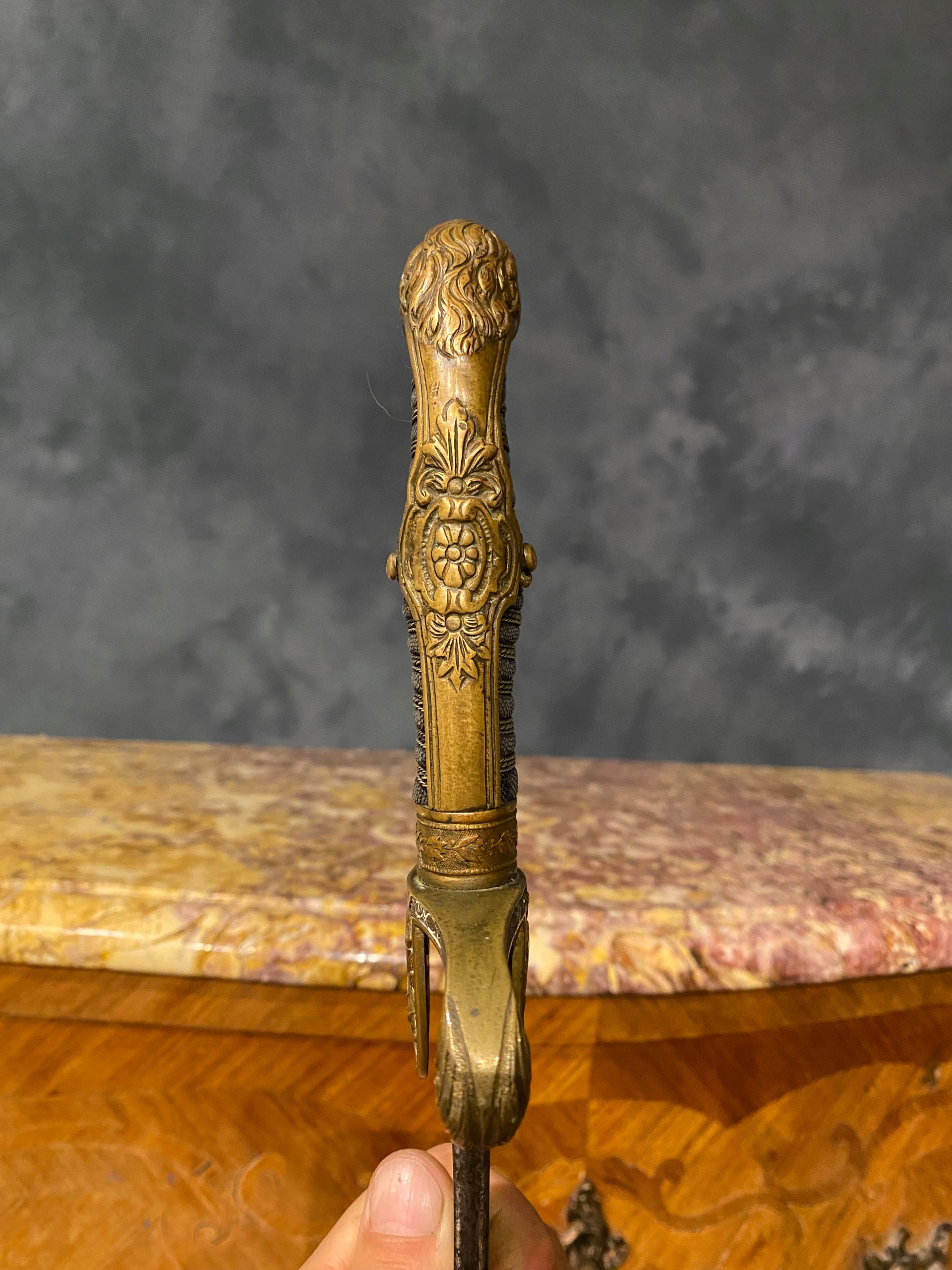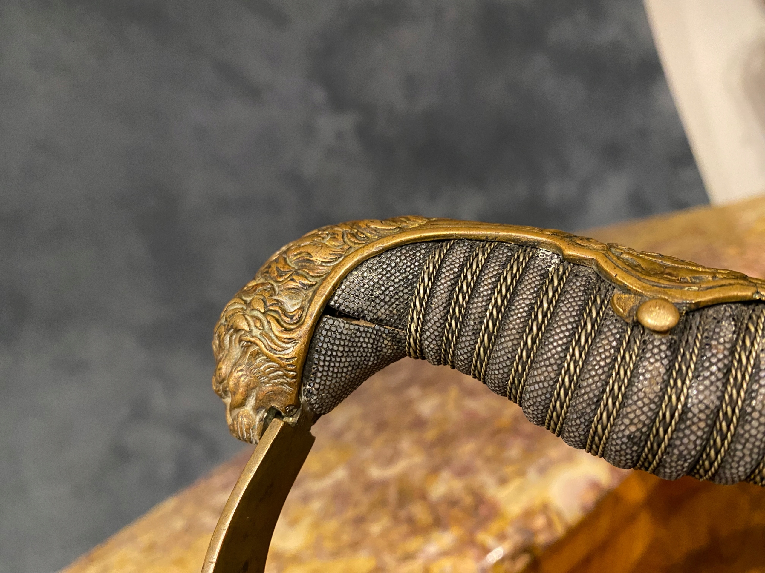 дерев’яна ручка, покрита сірою шкірою ящірки, косо з латунного скрученого дроту.