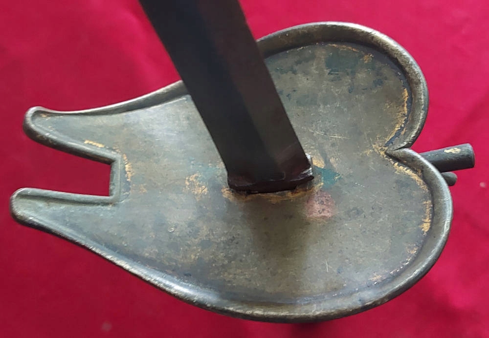Копія, видна на фотографіях. Лезо покрите по всій довжині рівномірної, маленької каші. Світло -ручка латунна. Оригінальна, щільна, латунна коса зберігається на стеблі. Вал ручки скручений на голові (як ви бачите на малюнках), голова нахилена від осі.