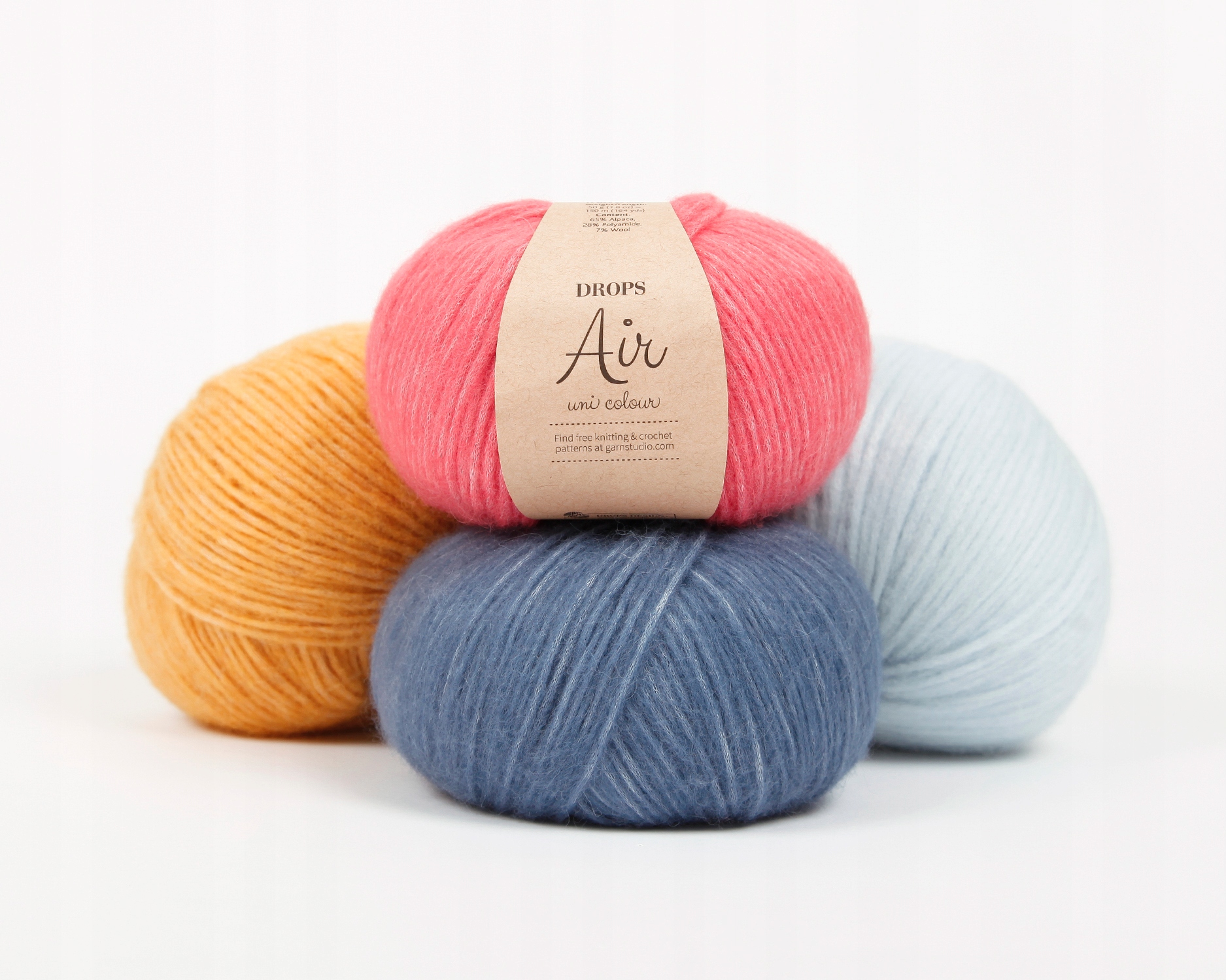 DROPS Air, як випливає з назви, дуже повітряна пряжа, приємна на шкірі. Він ідеально підходить для аксесуарів, шарфів, светрів зі структурними візерунками та кабелями. Одяг з цієї пряжі не дряпається, а значить, може носити кожен!