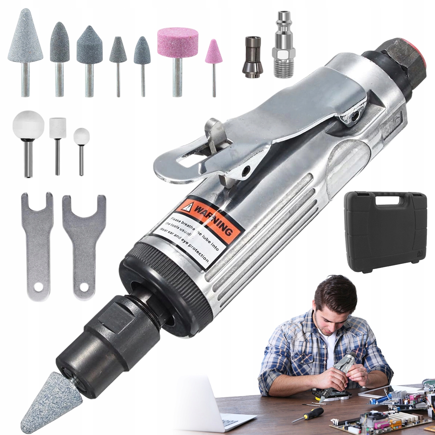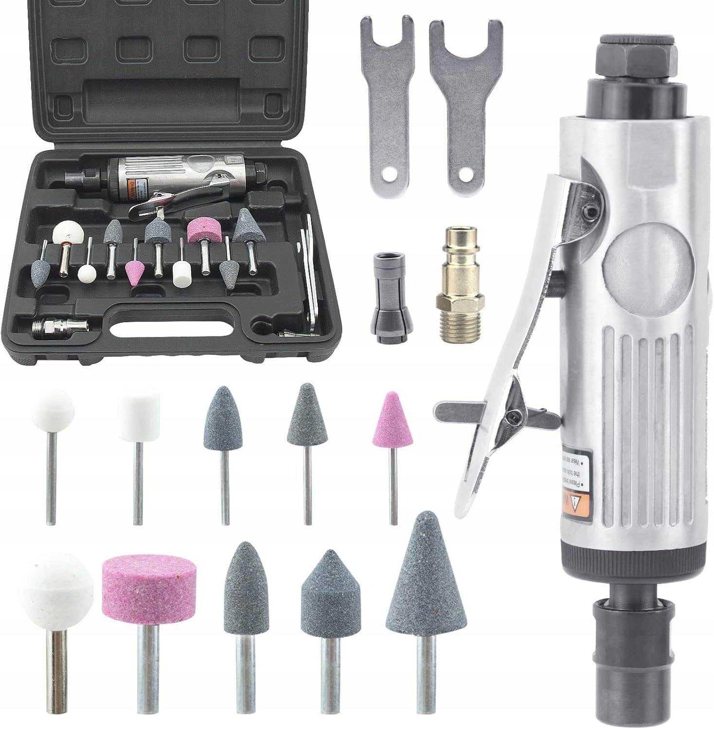 Набір включає 10 різних шліфувальних наконечників, що позбавляє від необхідності купувати додаткові аксесуари. Різноманітні форми та розміри дозволяють адаптувати інструмент до конкретного завдання.