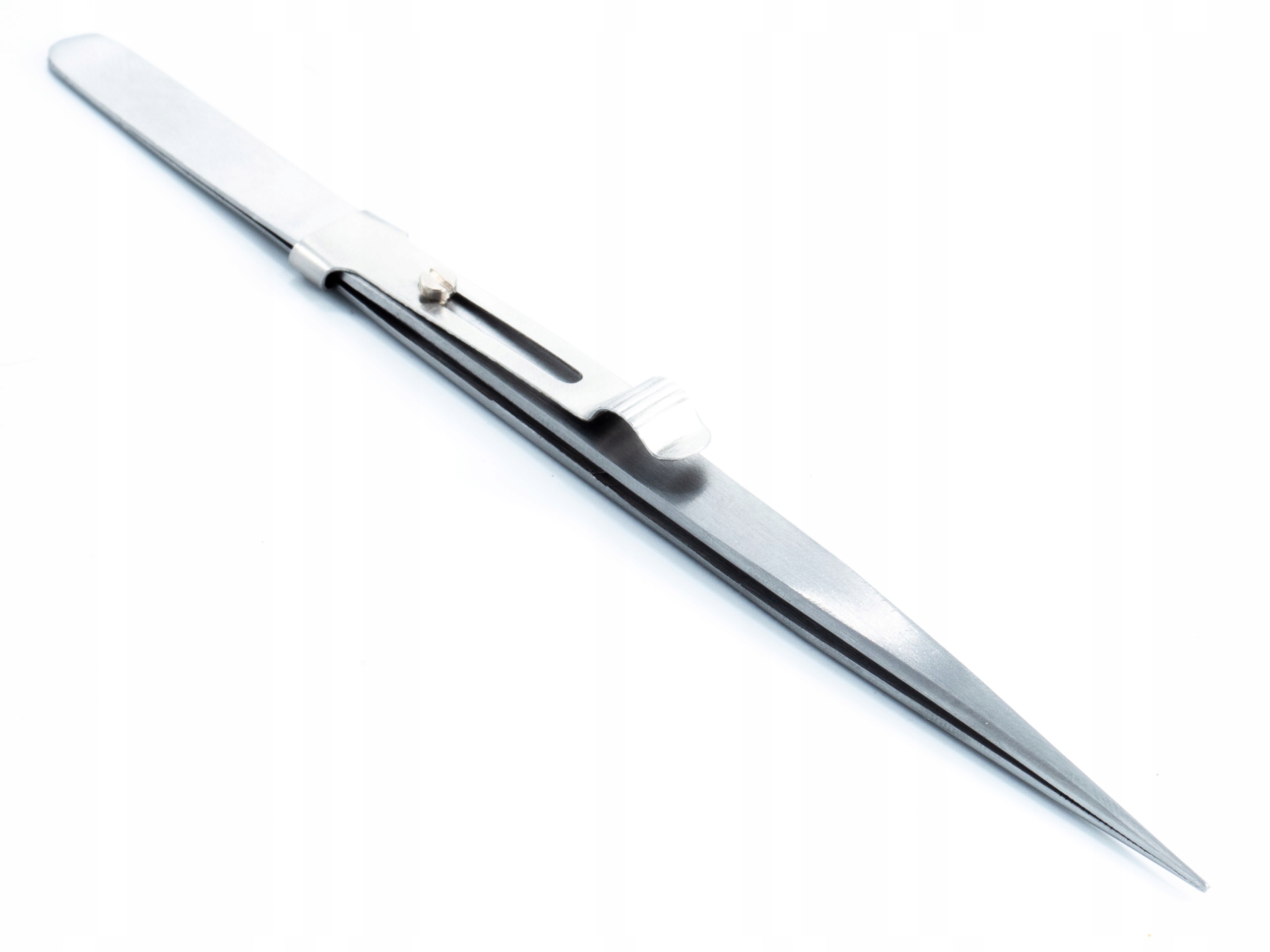 - Регламент: металевий бігунок дозволяє регулювати силу затиску предмета або обмежує хід/розкриття пінцета.