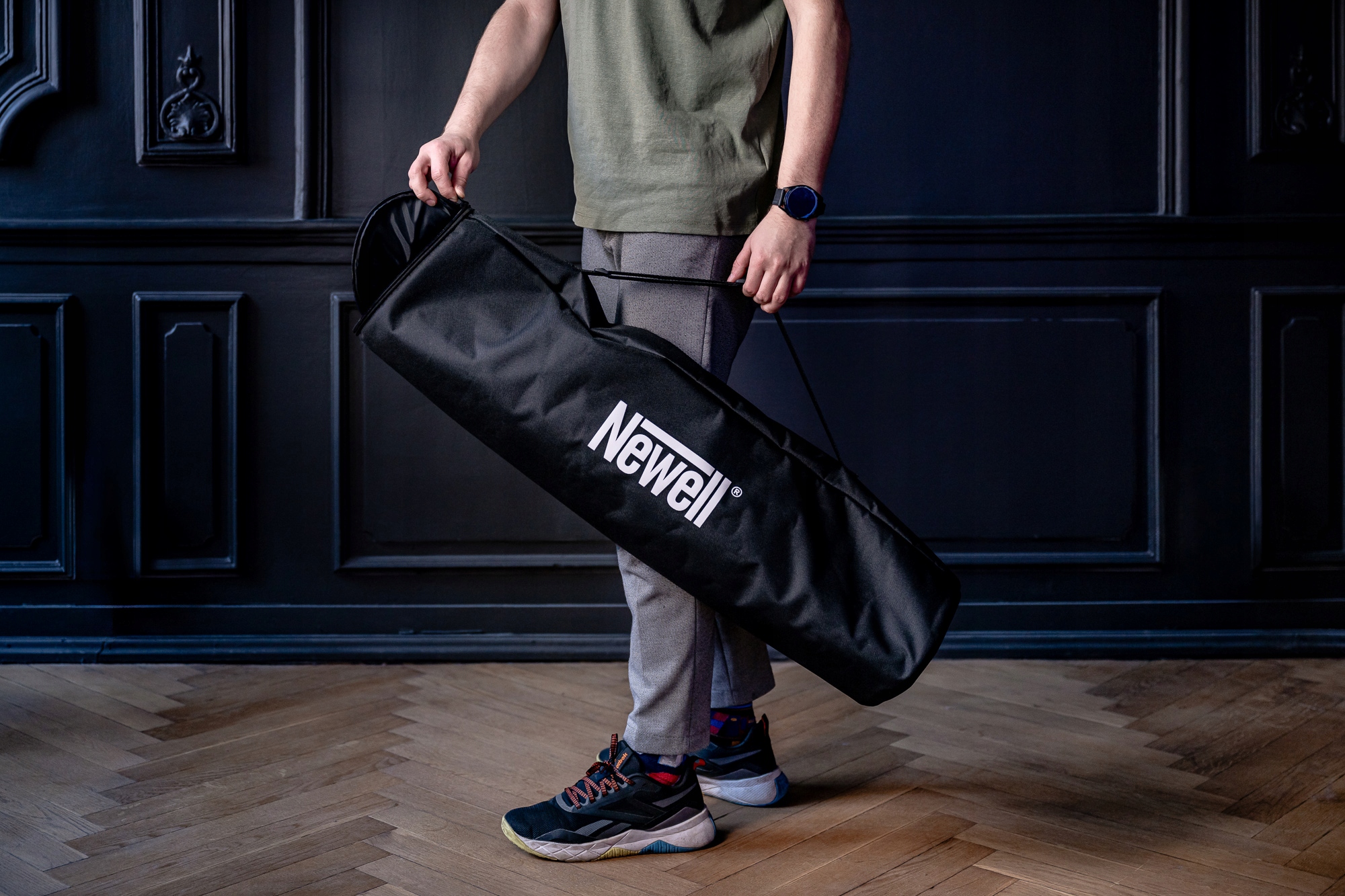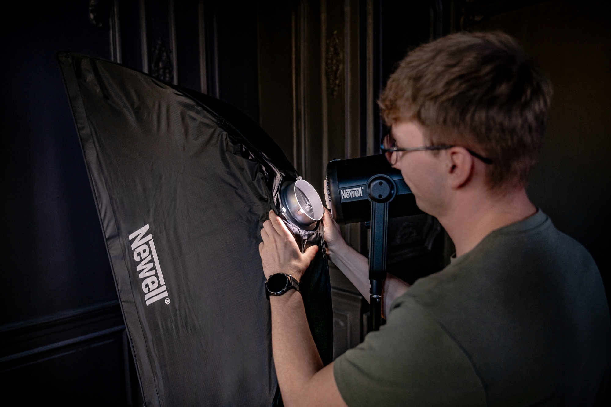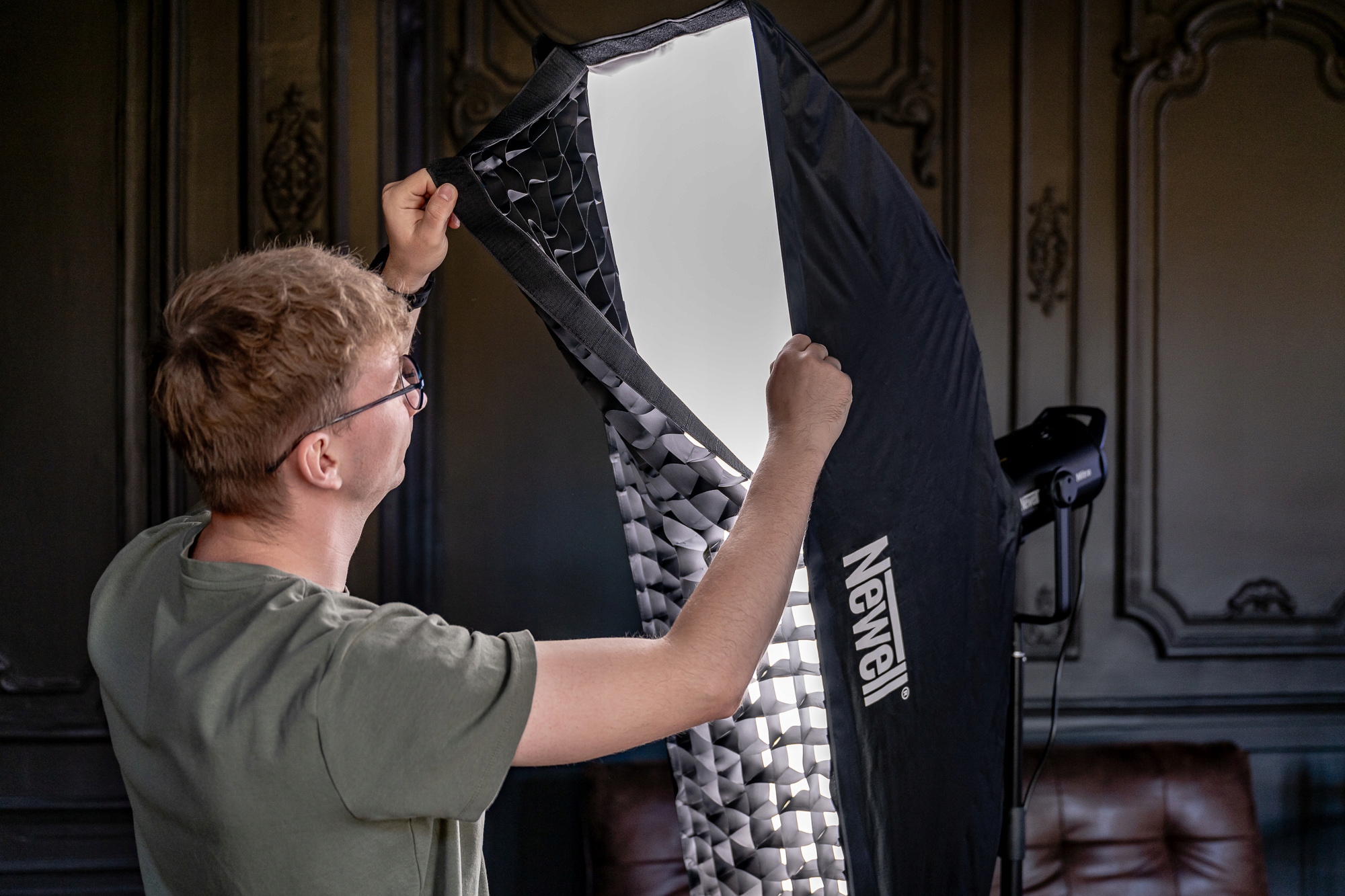 Прямокутний Newell 35 x 140 см був обладнаний сучасною системою швидкого складання, яка дозволяє швидко складати та розгорнути модифікатор. Завдяки вдосконаленому механізму розтягування барів дуже просто, а їх замок автоматично. Коли сеанс закінчується, просто натисніть одну кнопку, щоб уповільнити засувки і складіть софтбоксу. Весь механізм складання та розгортання нагадує той, який використовується в парасольках. За допомогою цього модифікатора ви можете легко працювати