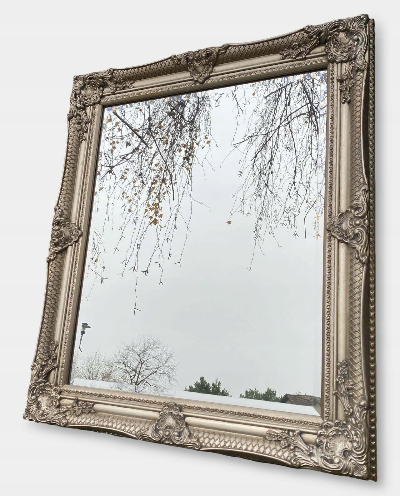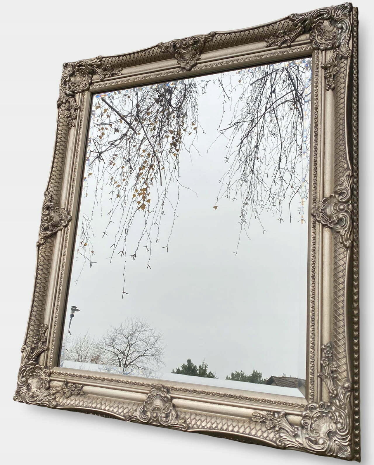 Красиве прямокутне дзеркало в багато прикрашеній срібній рамі. Старовинна рама сріблястого кольору, прикрашена орнаментом, виконана в старовинному палацовому стилі. Все це справляє чудове естетичне враження та має позачасовий стиль. Підходить для багатьох інтер'єрів.