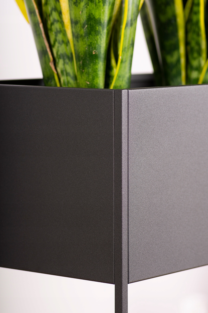 Сучасна металева клумба з вазоном, виготовлена з сталі з порошковим покриттям, міцна та стійка. Металева каструля виготовлена надзвичайно точно: найвища якість зварних швів, ретельно відшліфована та відполірована, а також ідеальне зварювання каструлі з ніжками є відмінними рисами цього продукту.
