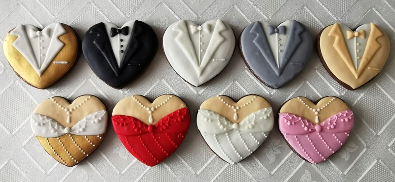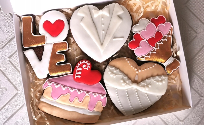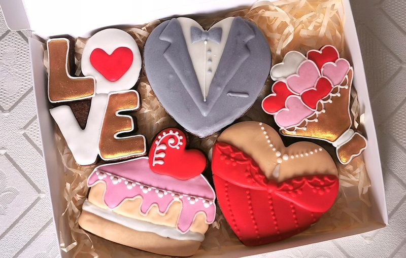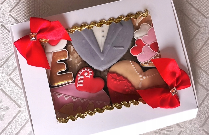 Тема продажу - 1 коробка, що містить 5 пряників (колір сукні та костюма на вибір із фотографії) і з квитком з подякою (квиток прикріплений до зовнішніх короб).