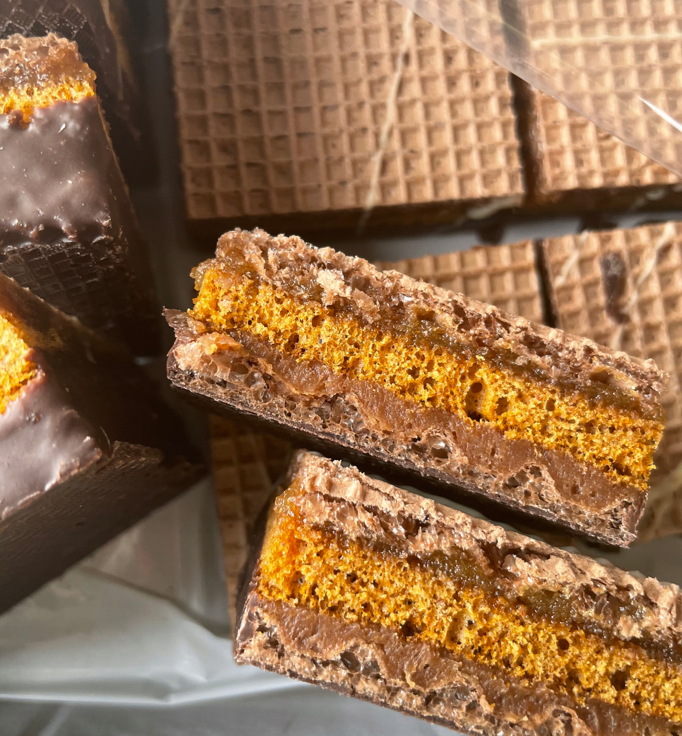 Ніжні вафлі з начинкою з пряників, крему та мармеладу, вкриті смачною какао-глазур'ю