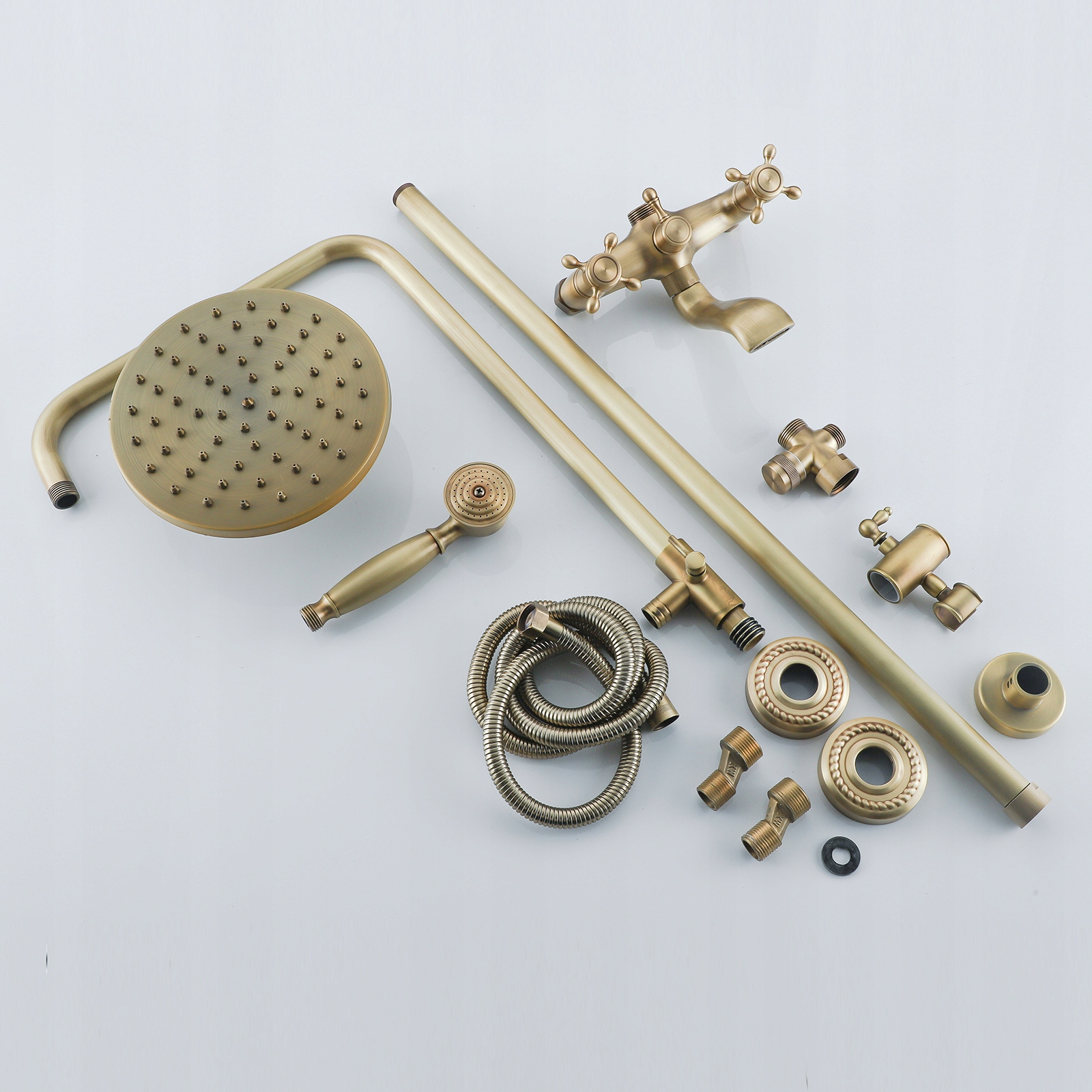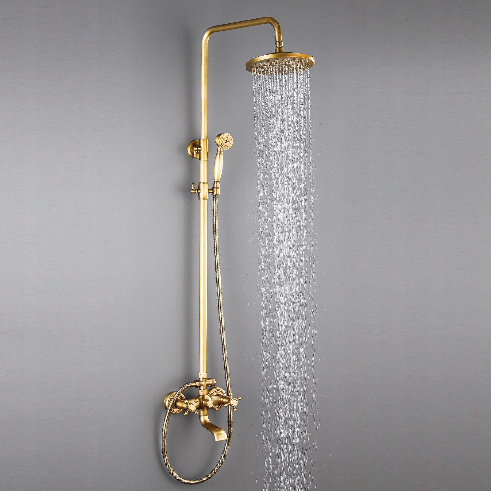 Цей душовий набір у старовинному стилі має непідвладне часу антикварне покриття, яке додає вашій ванній кімнаті елегантності та вінтажного шарму. Він оснащений ручним душем для гнучкого використання та нижнім випуском води, ідеальним для наповнення ванни або ополіскування. Виготовлений із високоякісної латуні високої майстерності, він забезпечує довговічність, стійкість до корозії та декоративну привабливість. Ідеальний вибір для ванних кімнат у класичному або вінтажному стилі.