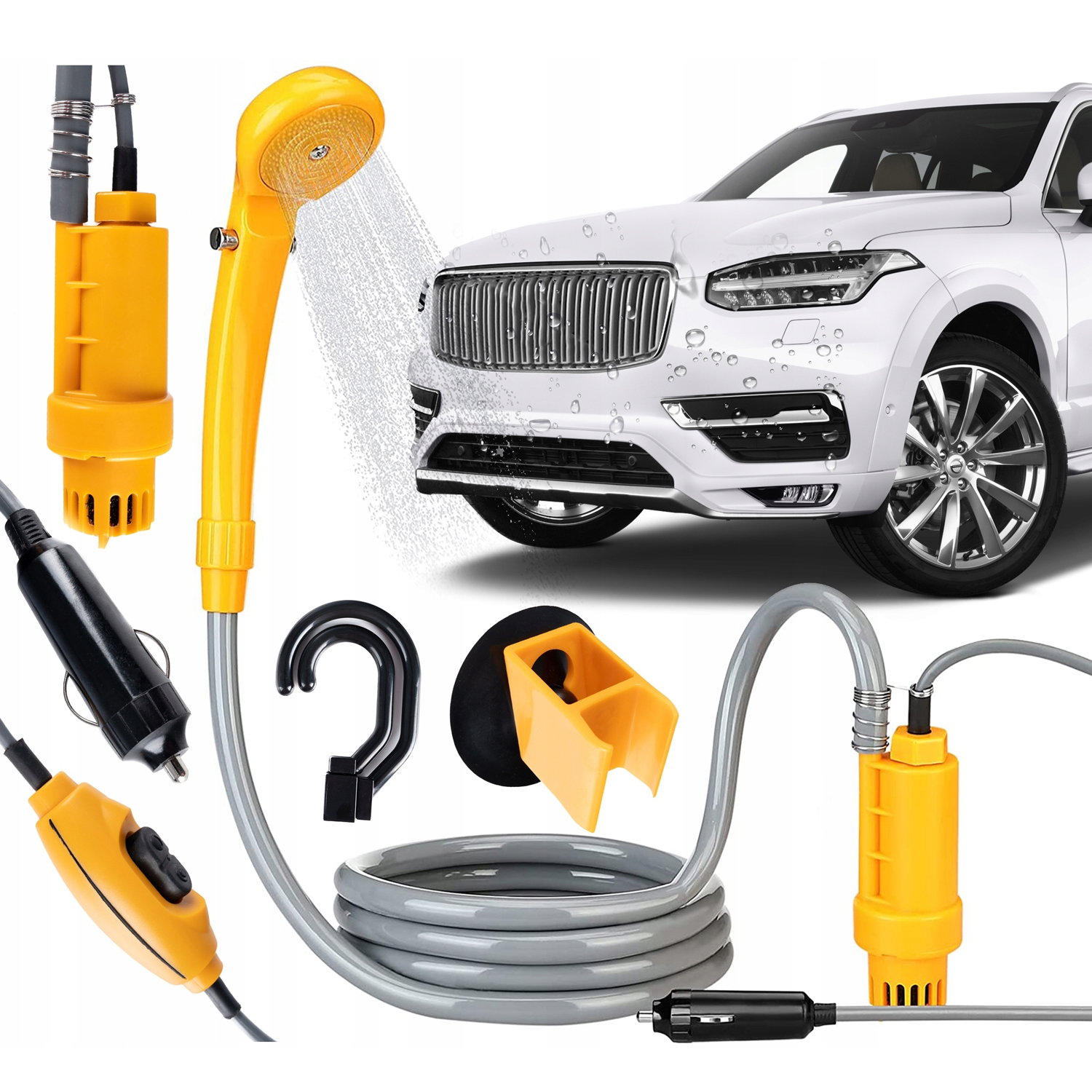 🚿 Простий у використанні,підключіть кабель до прикурювача автомобіля, установіть душову лійку, вставте шланговий насос у воду, увімкніть перемикач, вода стане постійним потоком. (Примітка: не кладіть насос у річку чи море, інакше це призведе до поломки.)