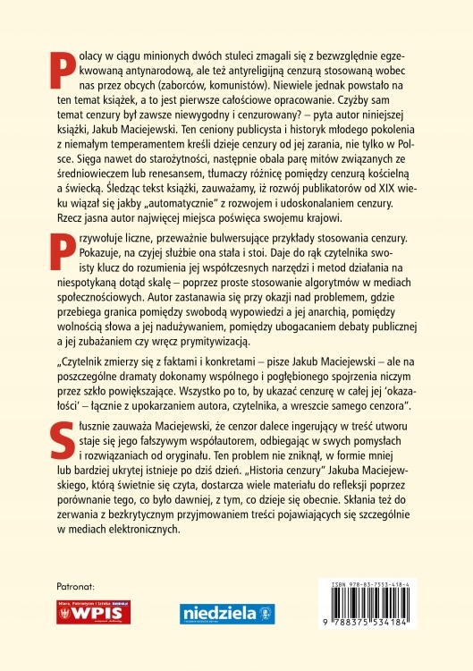Протягом останніх двох століть поляки боролися з безжалісно нав’язаною антинаціональною, але й антирелігійною цензурою, яку застосовували до нас іноземці (окупанти, комуністи). Проте на цю тему написано небагато книжок, і це перше комплексне дослідження.