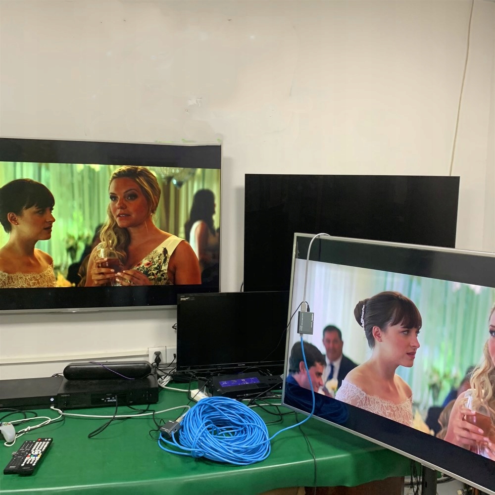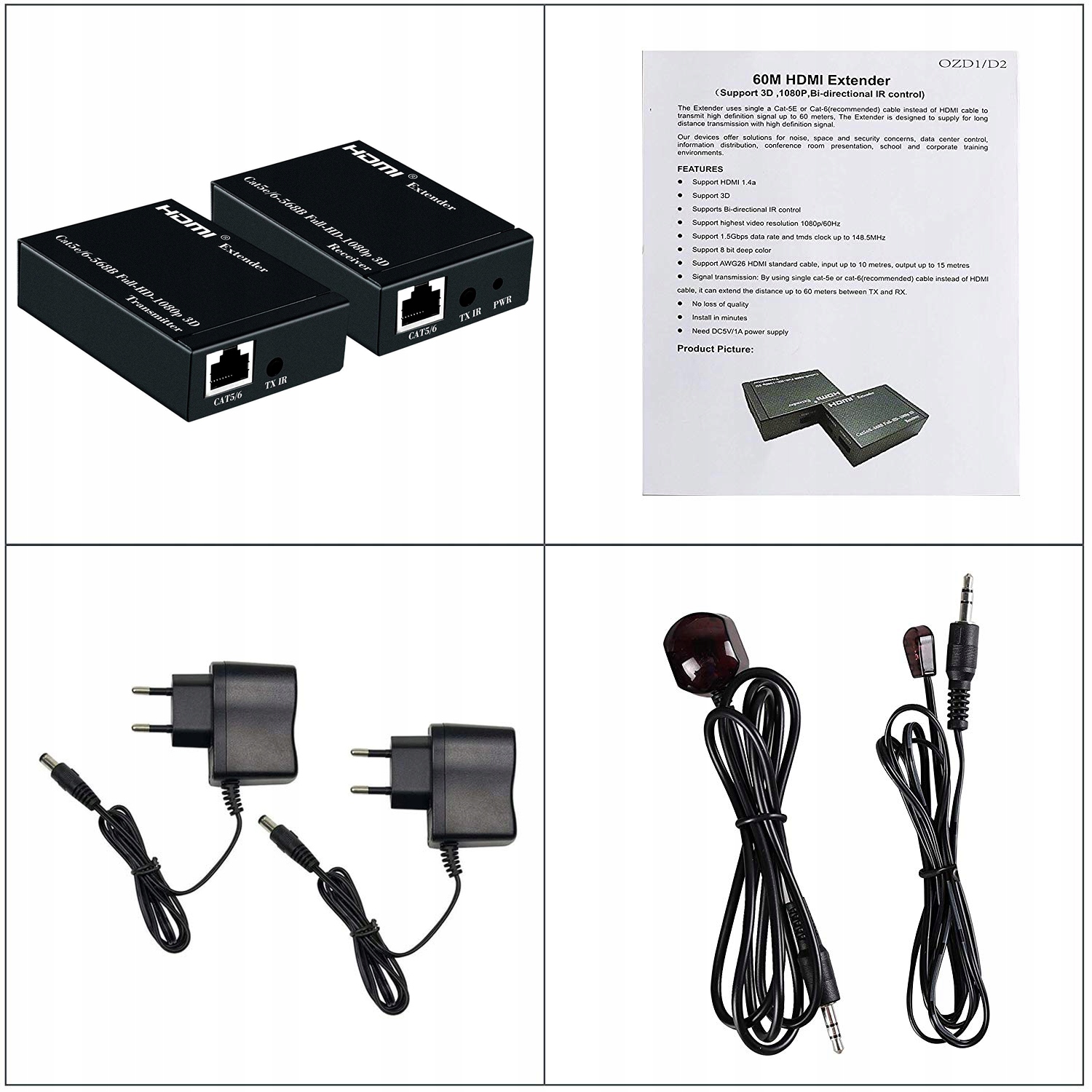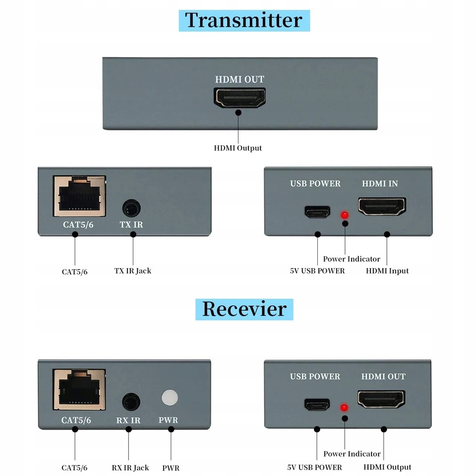 Подовжувач HDMI дозволяє підключати два пристрої з інтерфейсом HDMI на відстані понад 60 метрів. Передавач (TX) слід підключити за допомогою кабелю HDMI до виходу пристрою, який передає сигнал, наприклад, комп’ютера, а потім за допомогою кабелю LAN, підключеного до роз’єму RJ45, його слід підключити до гнізда (RX), а потім підключити до пристрою HDMI, який може відображати зображення, наприклад, телевізор або монітор.