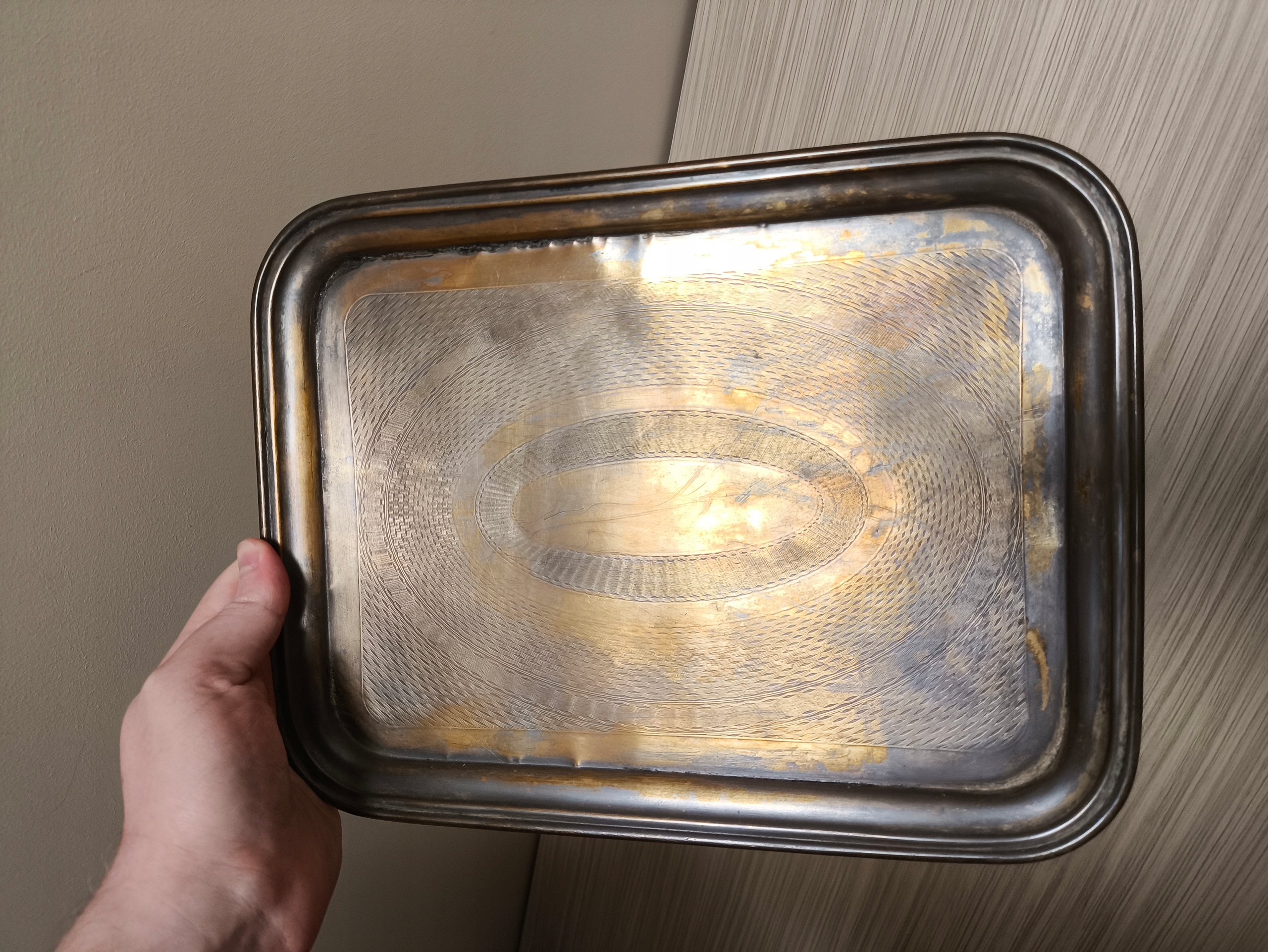 - Таця – візитниця з гільошованим верхом із посрібленої латуні, має закруглені кути та природну патину