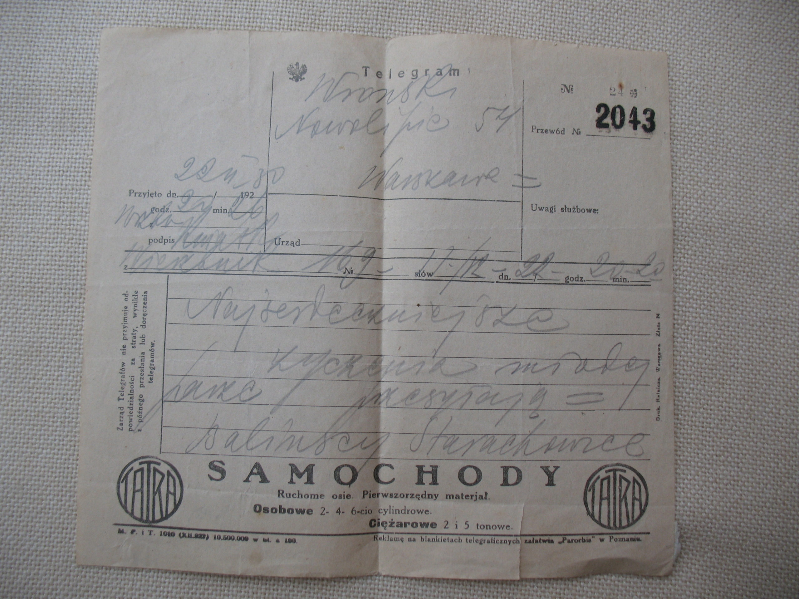 Przedwojenny TELEGRAM Z REKLAMĄ SAMOCHODÓW TATRA1930 r.