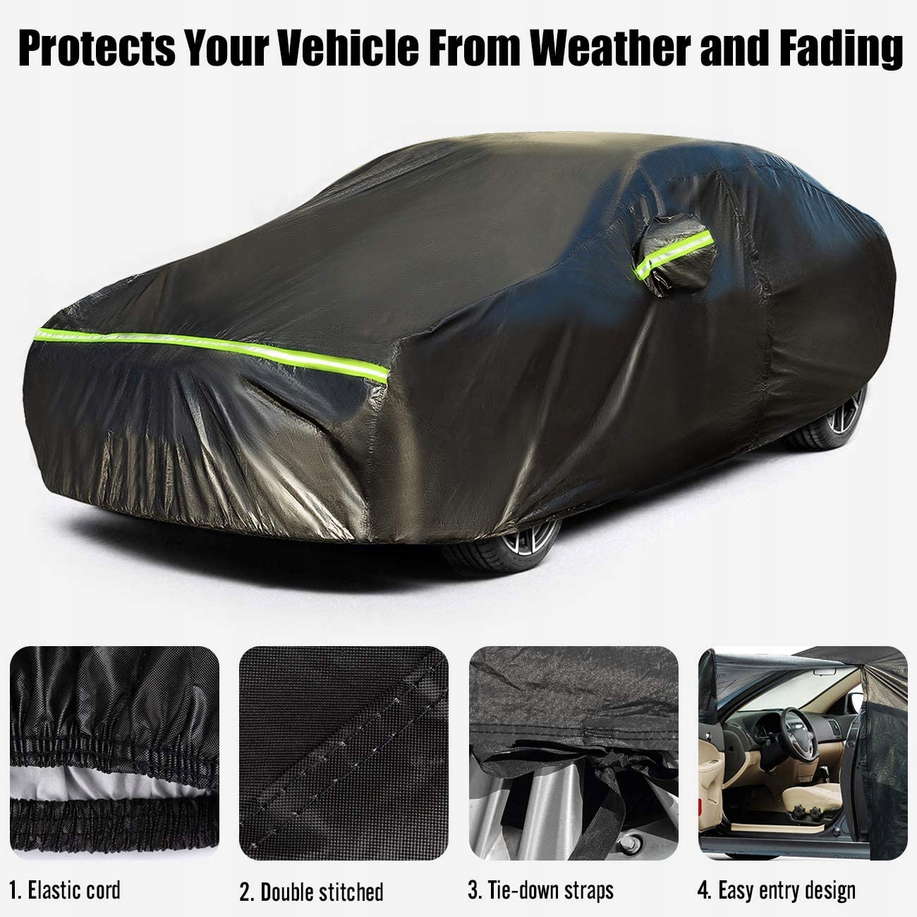 Застібка-блискавка з боку водія: на боці водія є застібка-блискавка для легкого доступу. Зручно сідати в машину, якщо вона вже має страховку. Легко одягається і знімається, не знімаючи чохол. На поверхні також видно нічні смуги відблисків. Таким чином ви зможете легко побачити контури автомобіля та уникнути аварій. Міцний матеріал: виготовлений з високоякісного 5-шарового міцного матеріалу, він міцний і водонепроникний. Бавовняний матеріал всередині запобігає подряпинам на вашому седані. Інші покриття з ПЕ та ПЕВА легко ламаються. Захист від погодних умов: автомобільні чохли Favoto забезпечують загальний захист вашого автомобіля від усіх елементів: пилу, снігу, промислових забруднювачів, пташиного посліду, листя, пилку, кислотних дощів тощо. Коли дме вітер, навіть якщо це легкий вітер, може здувати гілки, дрібні камінці тощо, що може пошкодити ваш автомобіль. 4 ремені безпеки знизу: гнучкий край чохла забезпечить гарне прилягання до вашого автомобіля, а 4 ремені безпеки під ним утримають ваш автомобіль на місці навіть у вітряні дні. Конструкція з подвійним швом робить чохол більш міцним.