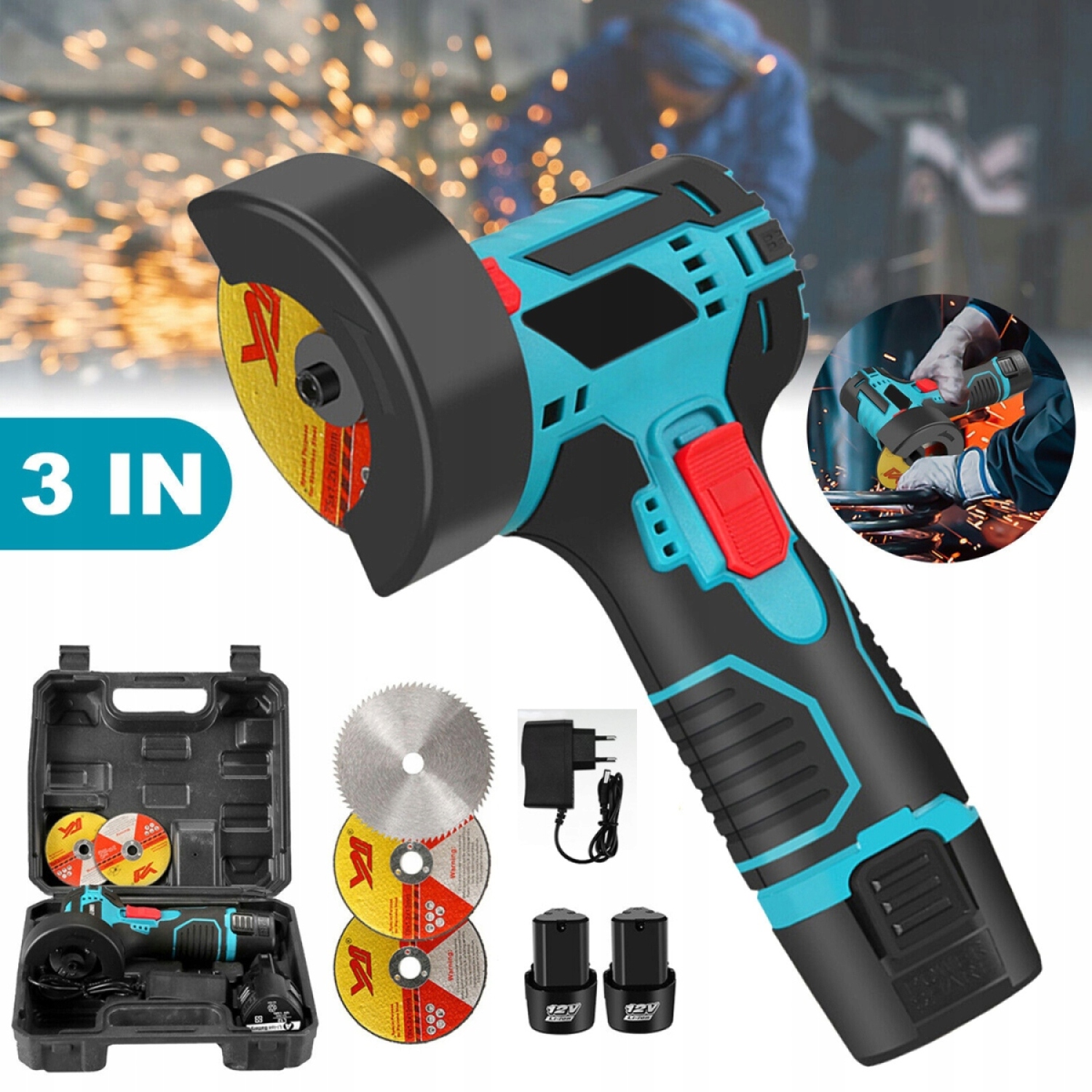 PRZENOŚNY MINI ELEKTRYCZNA SZLIFIERKA KĄTOWA 12V Z 2 BATERIA I 3 TARCZA