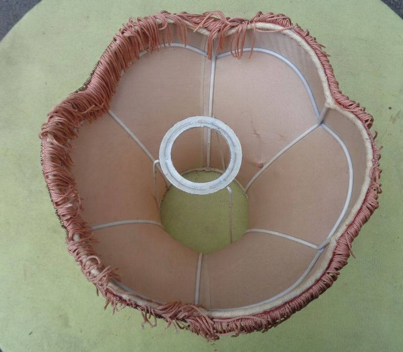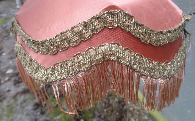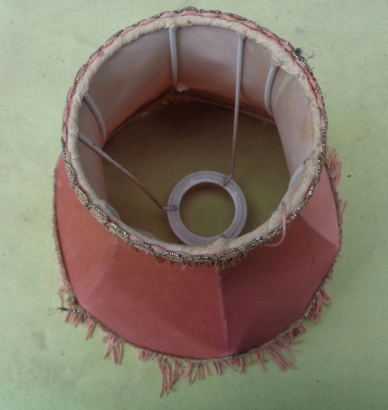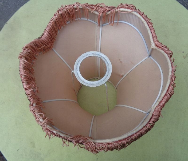 4 Виставка внизу була красиво прикрашена красивими подвійними смужками матеріалу та бахроми, що бігають навколо. Верх також був красиво прикрашений багатим ременем матеріалу та цікавою бахромою. Чаша виставки має цікаву форму. Він має невелику сліз матеріалу, що було видно на знімках. Я рекомендую це для всіх.