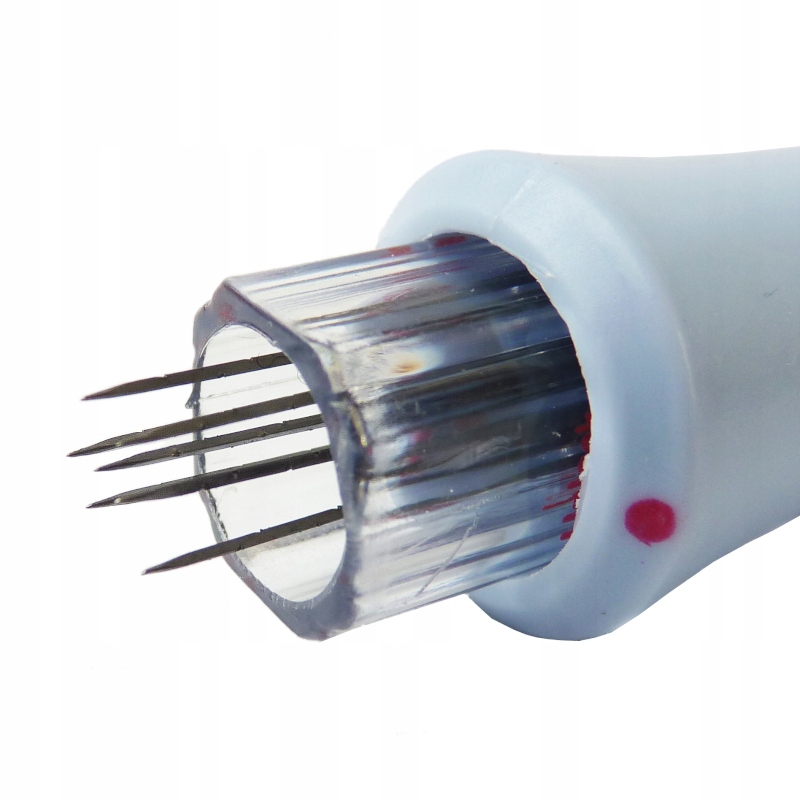 Валяльний пристрій оснащений 7 товстими голками. Пристрій можна використовувати для сухого і мокрого валяння. Голки можна легко і швидко замінити - просто відкрутіть синю частину пристрою і замініть голки. Пристрій призначений для утримання голок будь-якої товщини. Замок у нижній частині пристрою захищає голки від зламу під час транспортування, а також захищає користувача від уколів до та після роботи.