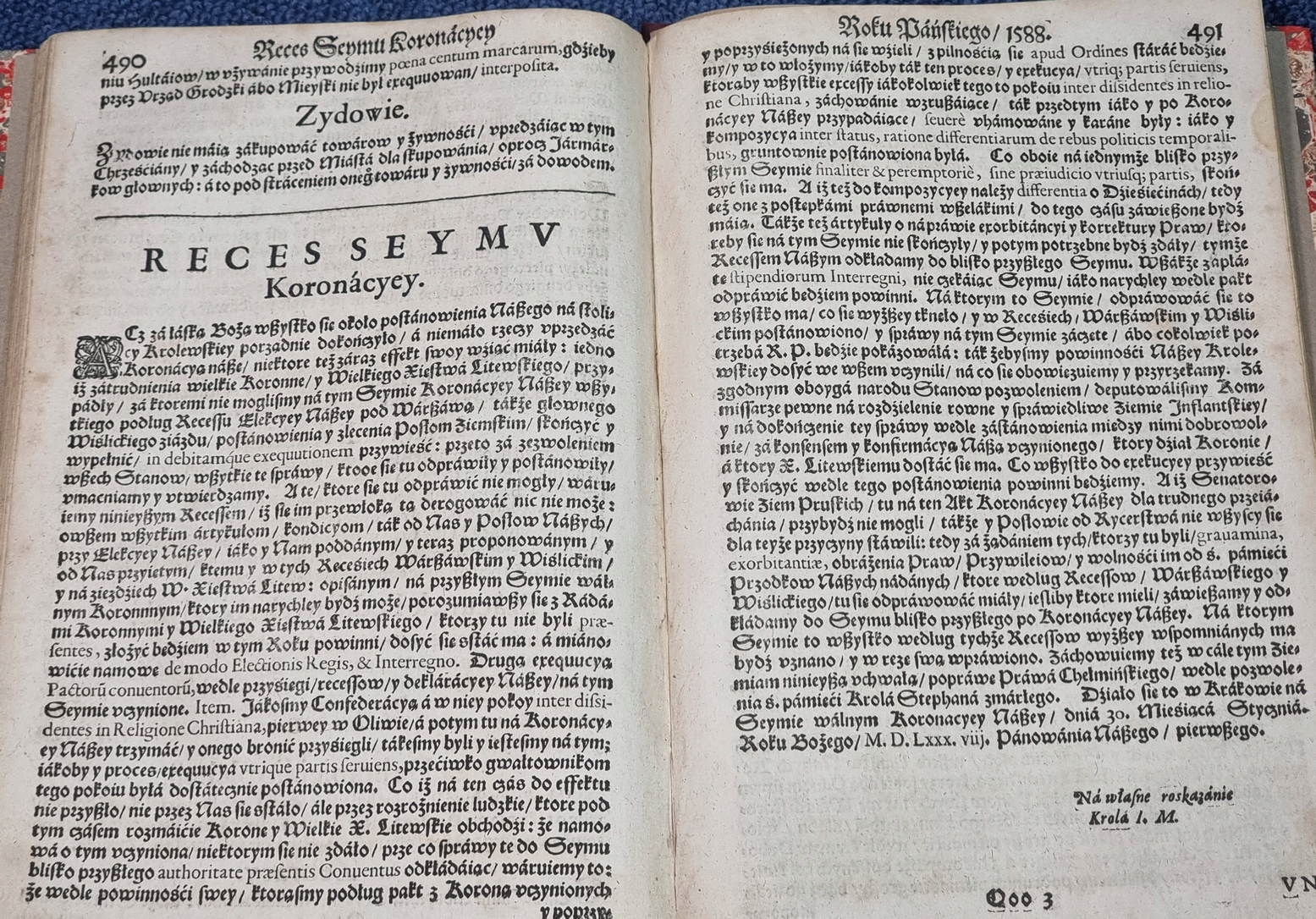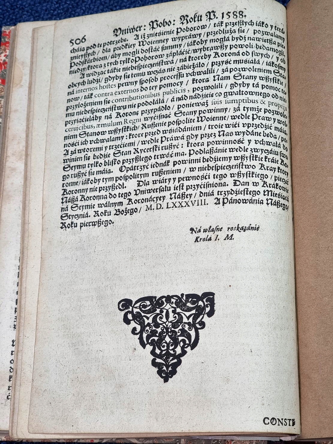 Зі сторінки 490 є «Reces Seymv Koronacyey», а зі сторінки 492 «Vniversał Poborowy року Божого 1588»