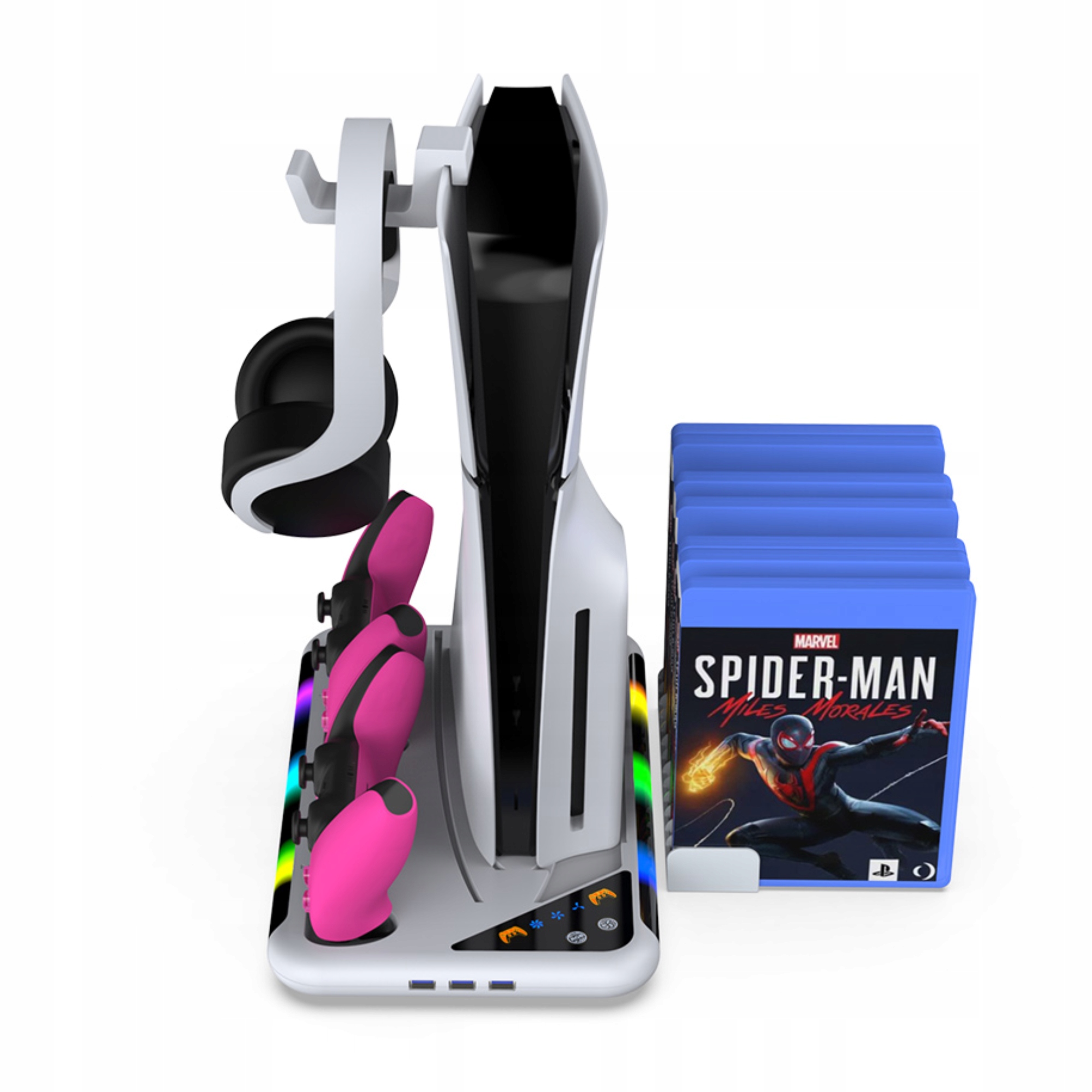 Док -станція відрізняється ультра -титкою, сучасним дизайном, який ідеально гармонізується з естетикою консолі PS5. Продукт сумісний з кожною версією PS5. 4 Станція має три порти USB, включаючи один з функцією передачі даних , що дозволяє легко підключати та заряджати різні пристрої. Розширене RGB освітлення з різними режимами світла збагачує візуальний досвід під час гри, що робить цю позицію незамінним доповненням для кожного гравця PS5.
