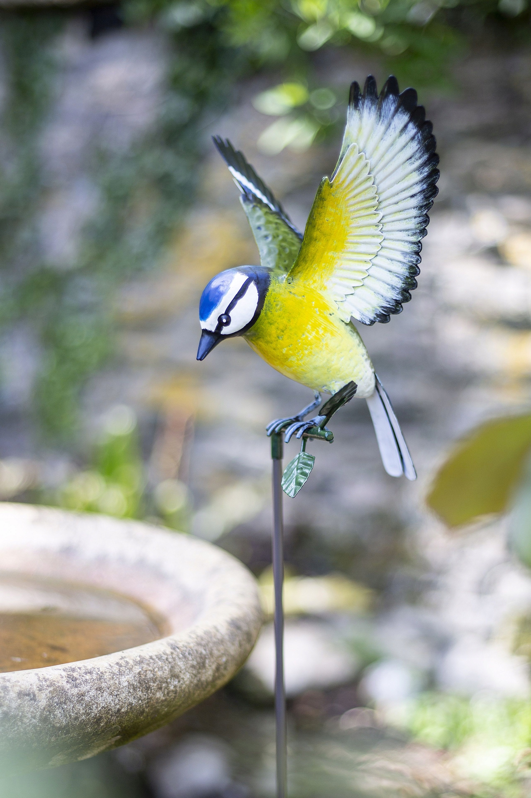Представлений птах – блакитна синиця, яка характеризується яскравими кольорами. Синиця ніби сідає на гілочку, яка є загнутою верхньою частиною тичинки, на якій вона тримається. Розпростерті крила синиці створюють чудовий ефект, особливо якщо розташувати жердину серед садових рослин так, щоб вона її трохи приховала.