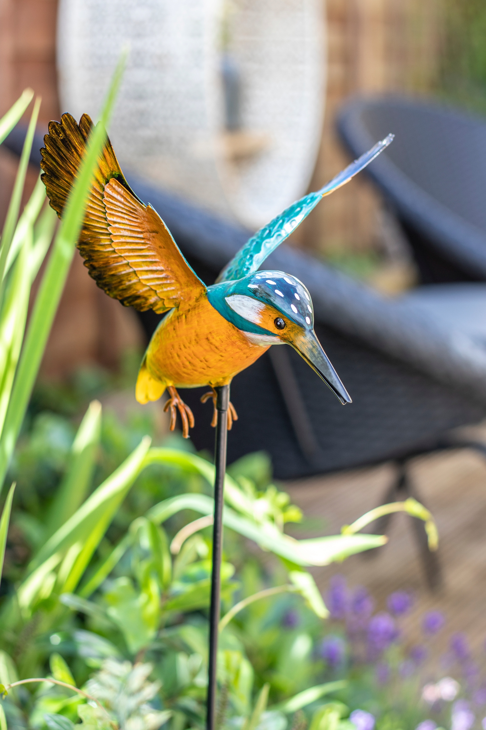 Представлений птах – зимородок, добре впізнаваний завдяки своїм кольорам. Птах із жовтим тулубом, синьою спиною та характерним забарвленням голови ніби сідає на землю в нашому саду. Він підтримується на верхній частині вудилища таким чином, що імітує політ. Розпростерті крила зимородка створюють чудовий ефект, особливо якщо ми розташуємо жердину серед садових рослин таким чином, щоб трохи приховати її.