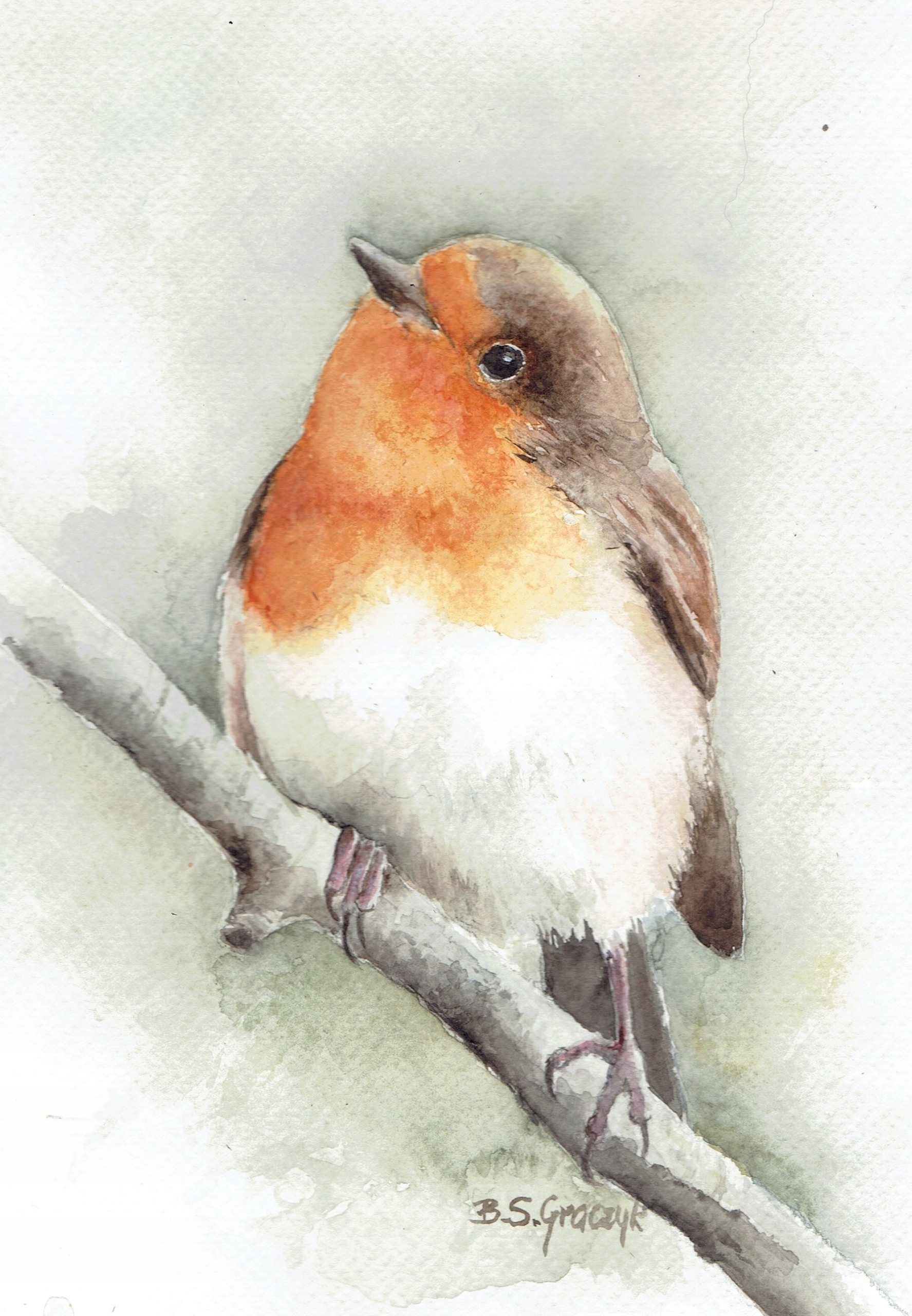 Ptak , ptaki rudzik- akwarela (z passe-partout)
